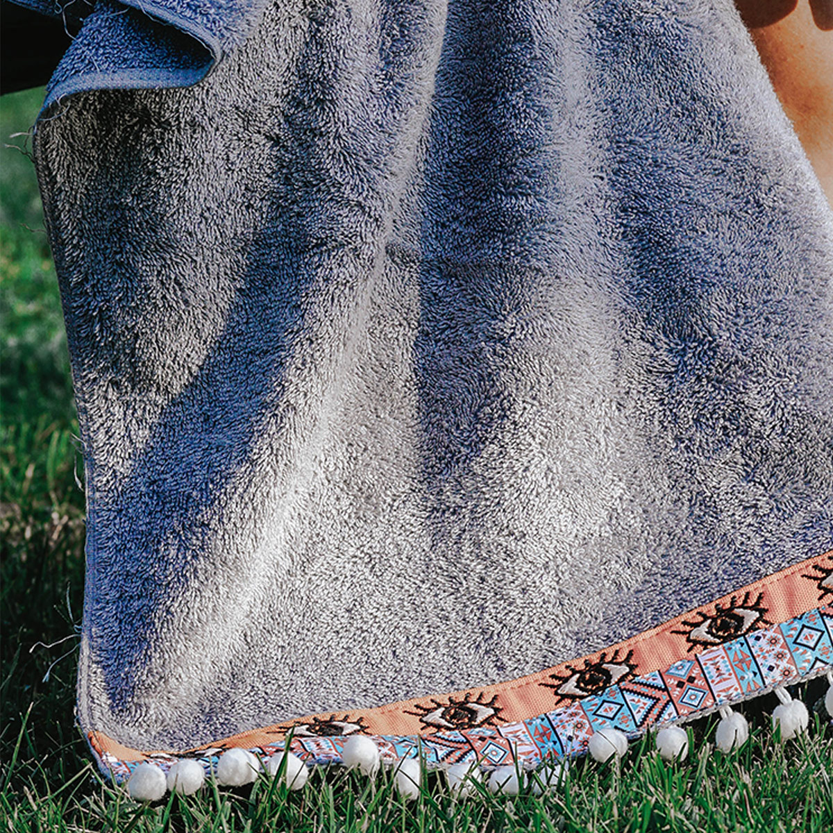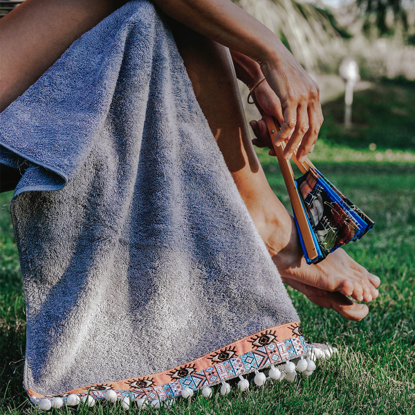 Πετσέτα θαλάσσης από την εταιρεία White Fabric. Έχει γκρι χρώμα, υφασμάτινη φάσα με έθνικ σχέδιο και μαύρες φουντίτσες στο τελείωμα. Η σύνθεσή της από 100% εξαιρετικό βαμβακερό ύφασμα, βάρους 480gsm, την καθιστά πολύ απαλή και απορροφητική.