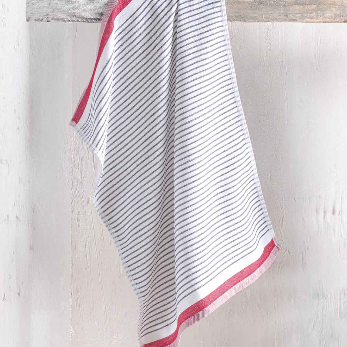 Ποτηρόπανο σε λευκό χρώμα, με φούξια λεπτομέρειες και ριγέ σχέδιο από την εταιρεία Rythmos. Το ύφασμα είναι από 100% βαμβάκι. Χρησιμοποιήστε πετσέτες κουζίνας για να στεγνώσετε τα χέρια σας αλλά και τα πιάτα σας με ευκολία.