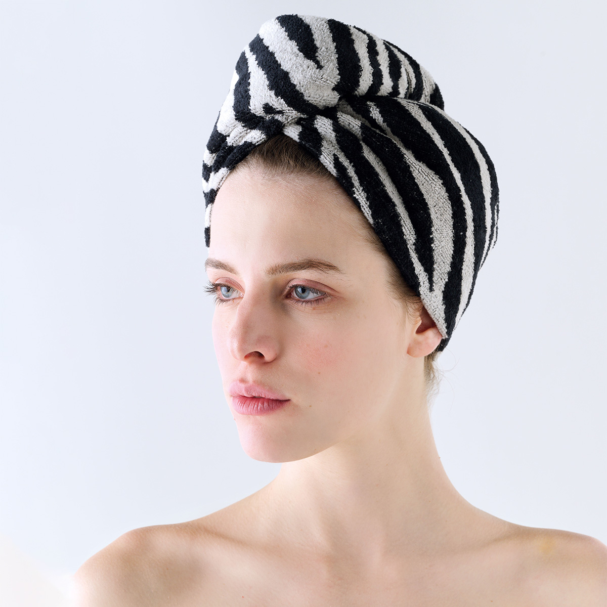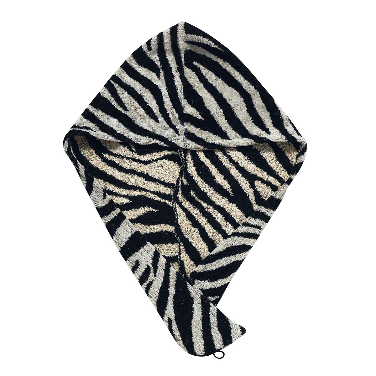 Πετσέτα στεγνώματος μαλλιών από την εταιρεία Kentia σε εκρού και μαύρο χρώμα με animal print μοτίβο. Είναι κατασκευασμένη από 100% βαμβάκι, βάρους 500gsm, αφράτη και απορροφητική. Διαθέτει κουμπί για σταθερή εφαρμογή. Προστατεύει τα μαλλιά και μειώνει το χρόνο στεγνώματος.