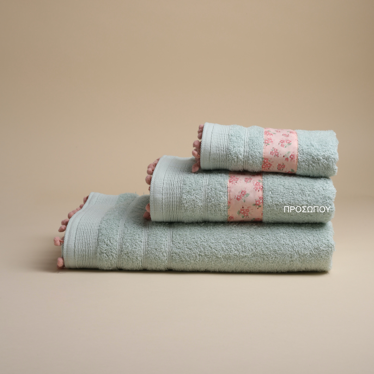 Πετσέτα προσώπου από την εταιρεία White Fabric. Έχει βεραμάν χρώμα με φλοράλ φάσα σε ροζ αποχρώσεις και πον πον στο τελείωμα. Κατασκευασμένη από 100% εξαιρετικό βαμβακερό ύφασμα, βάρους 500gsm, που την κάνει απαλή και απορροφητική.