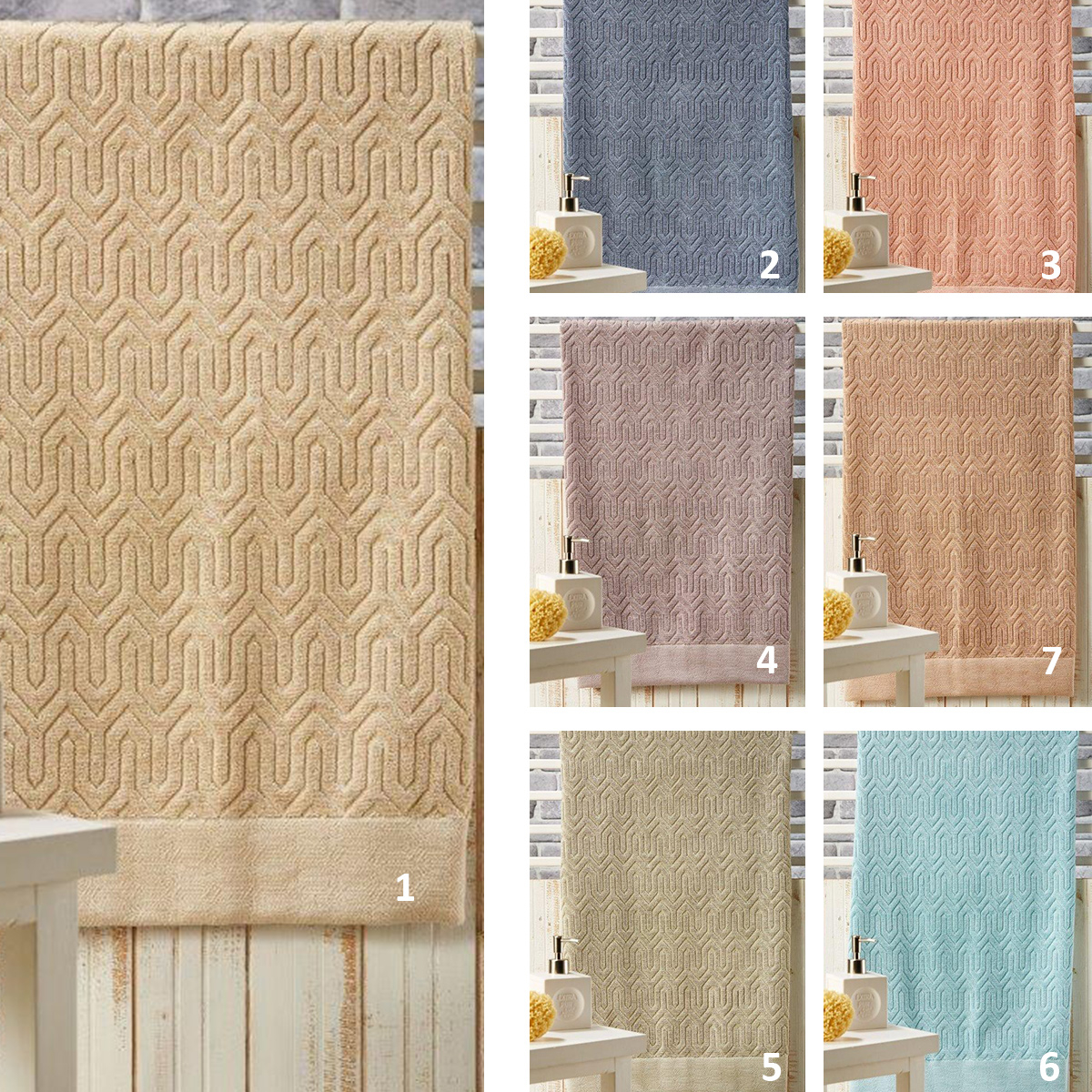 Πετσέτα σώματος διαθέσιμη σε 7 γήινες και μοντέρνες αποχρώσεις από την εταιρεία Whitegg. Έχουν ανάγλυφο γεωμετρικό σχέδιο. Η σύνθεση από 100% βαμβάκι βάρους 550gsm, τις καθιστά απαλές και αρκετά απορροφητικές.