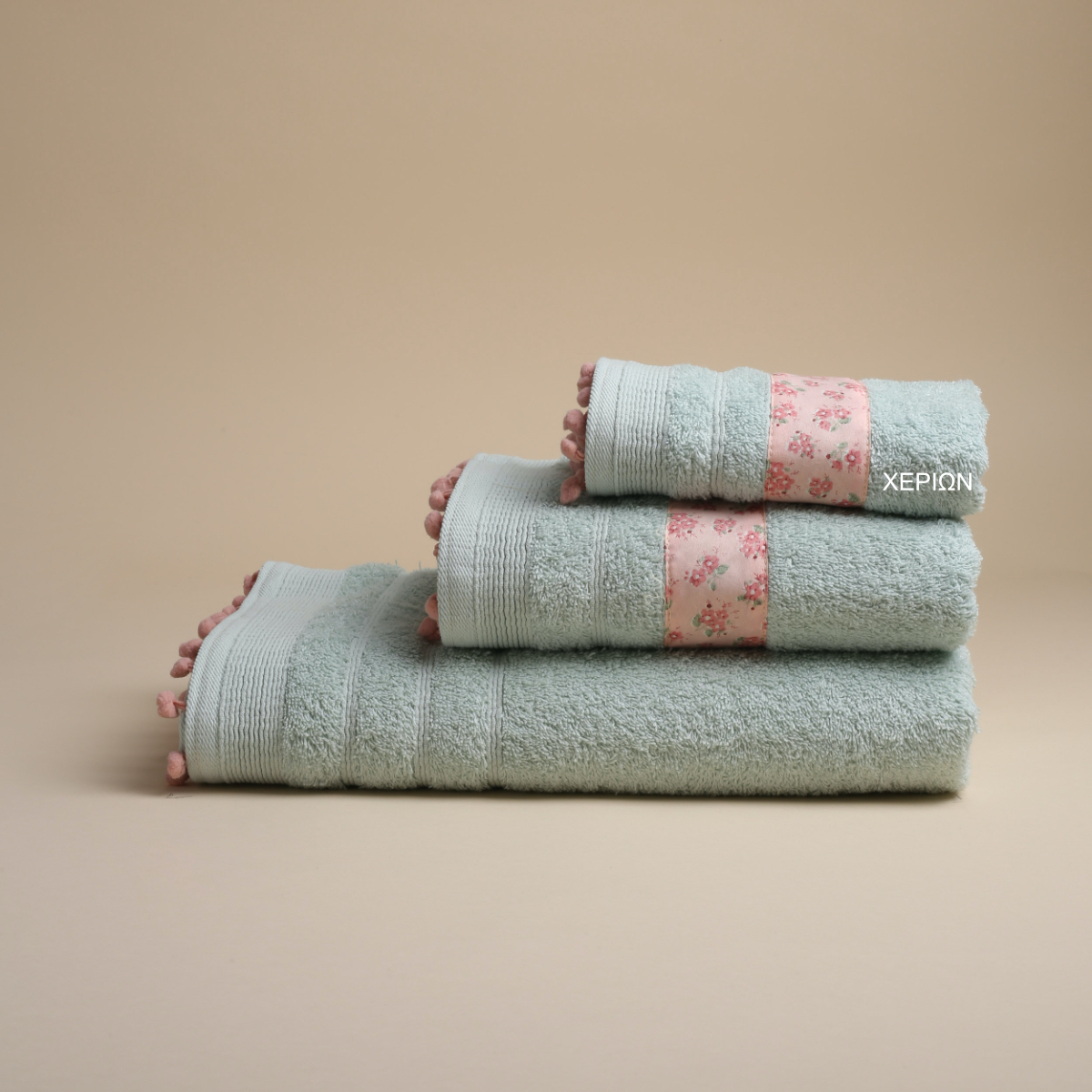 Πετσέτα χεριών από την εταιρεία White Fabric. Έχει βεραμάν χρώμα με φλοράλ φάσα σε ροζ αποχρώσεις και πον πον στο τελείωμα. Κατασκευασμένη από 100% εξαιρετικό βαμβακερό ύφασμα, βάρους 500gsm, που την κάνει απαλή και απορροφητική.