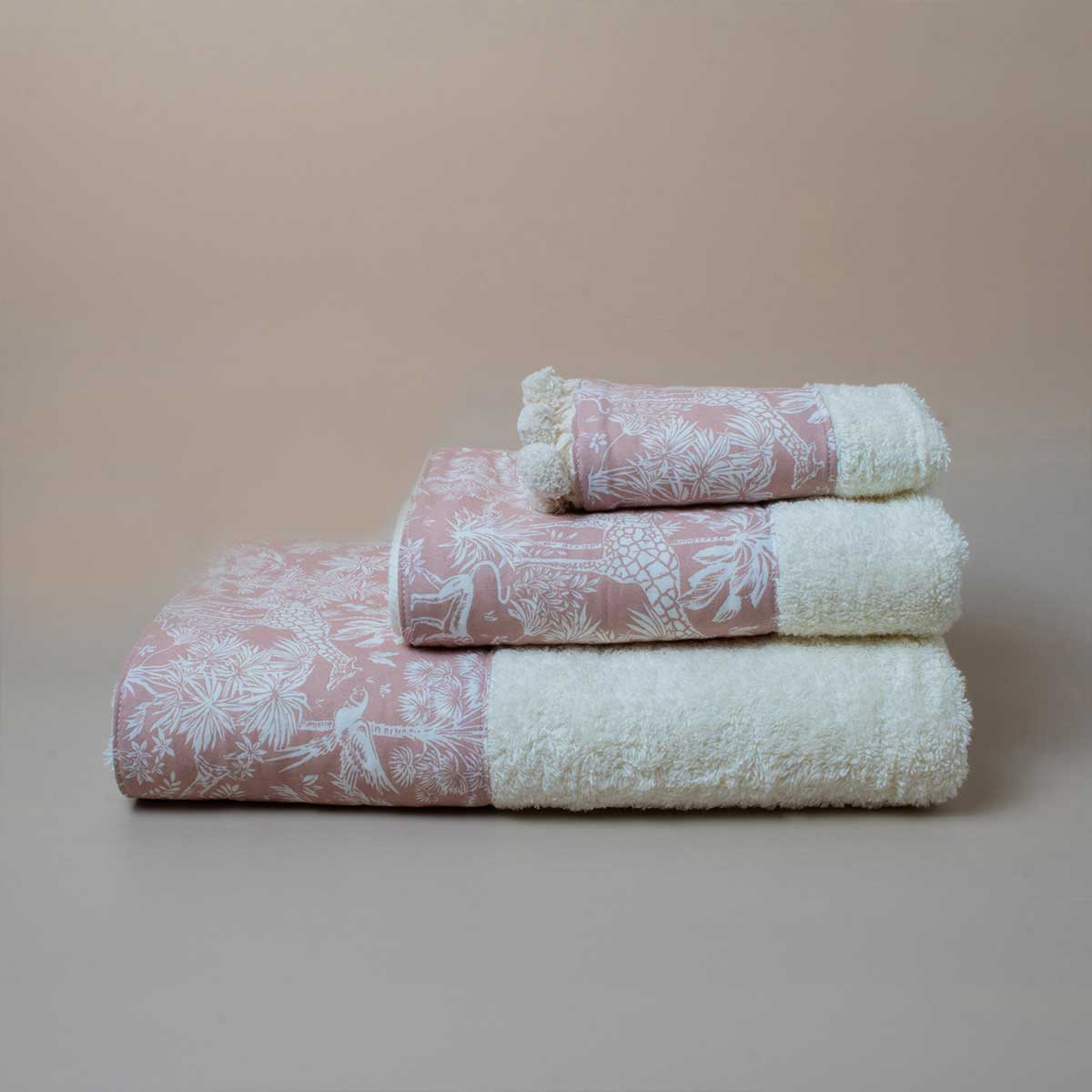 Πετσέτα χεριών από την εταιρεία White Fabric σε εκρού χρώμα. Διαθέτει pom-pom και ροζ φάσα στο κάτω μέρος με τρόπικαλ σχέδιο. Είναι κατασκευασμένη από 100% βαμβάκι, εξαιρετικής ποιότητας, βάρους 500gsm, που την καθιστά απαλή και πολύ απορροφητική. Συνδυάστε τη με τα υπόλοιπα είδη της ίδιας σειράς για ένα ολοκληρωμένο σετ.