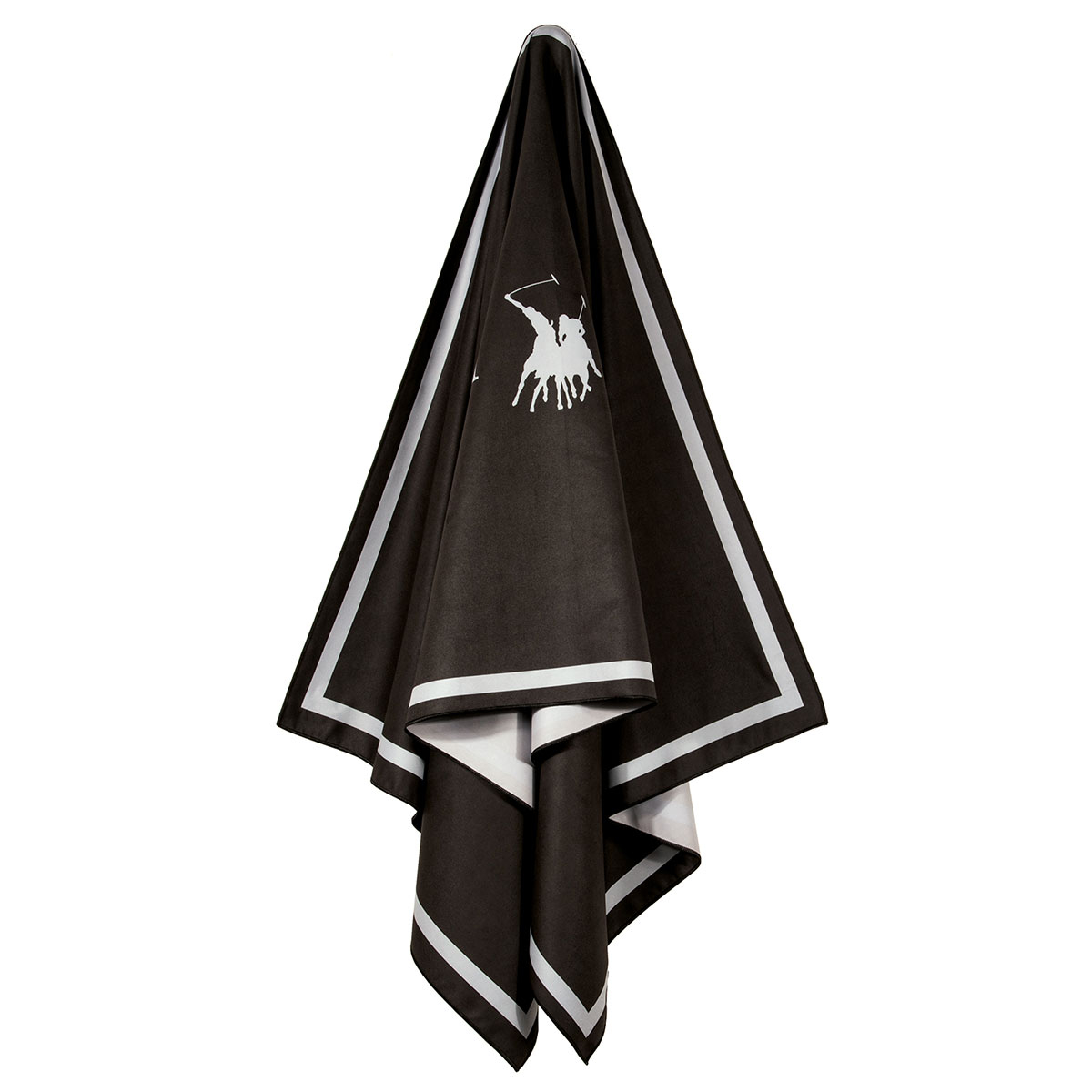 Πετσέτα θαλάσσης από μικροϊνες σε μαύρο χρώμα, με γκρι λεπτομέρειες και το λογότυπο του οίκου Greenwich Polo Club. Είναι κατασκευασμένη από 100% υποαλλεργικό microfiber βάρους 280gsm, που την καθιστά υπέρ απορροφητική, συμπαγής. Δεν κολλάει η άμμος πάνω της, είναι ελαφριά και έχει έναν μικρό θηλάκι για να την κρεμάτε παντού. Ιδανική λύση για στιλάτες εμφανίσεις στην παραλία, με ποιότητα και άνεση.