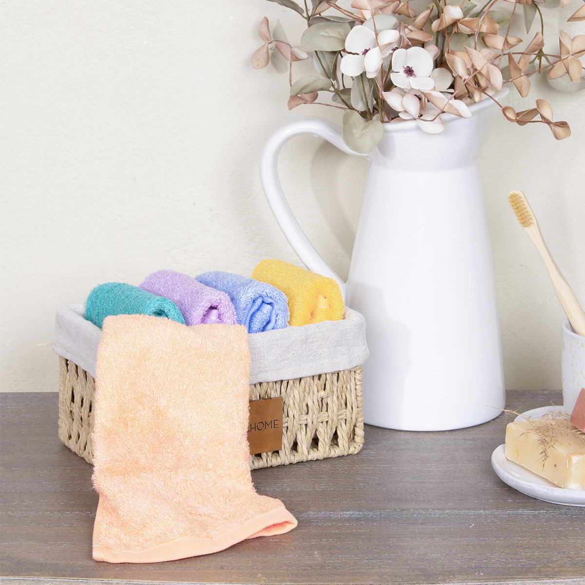 Σετ μονόχρωμες λαβέτες 5τμχ σε πολύχρωμες αποχρώσεις και συσκευασία καλαθάκι δώρου από την εταιρεία Nima. Οι πετσέτες είναι κατασκευασμένες από 100% bamboo βαμβάκι που προσφέρει απαλότητα και αντιβακτηριακές ιδιότητες. Πρακτικό δώρο και παράλληλα οικονομική επιλογή.