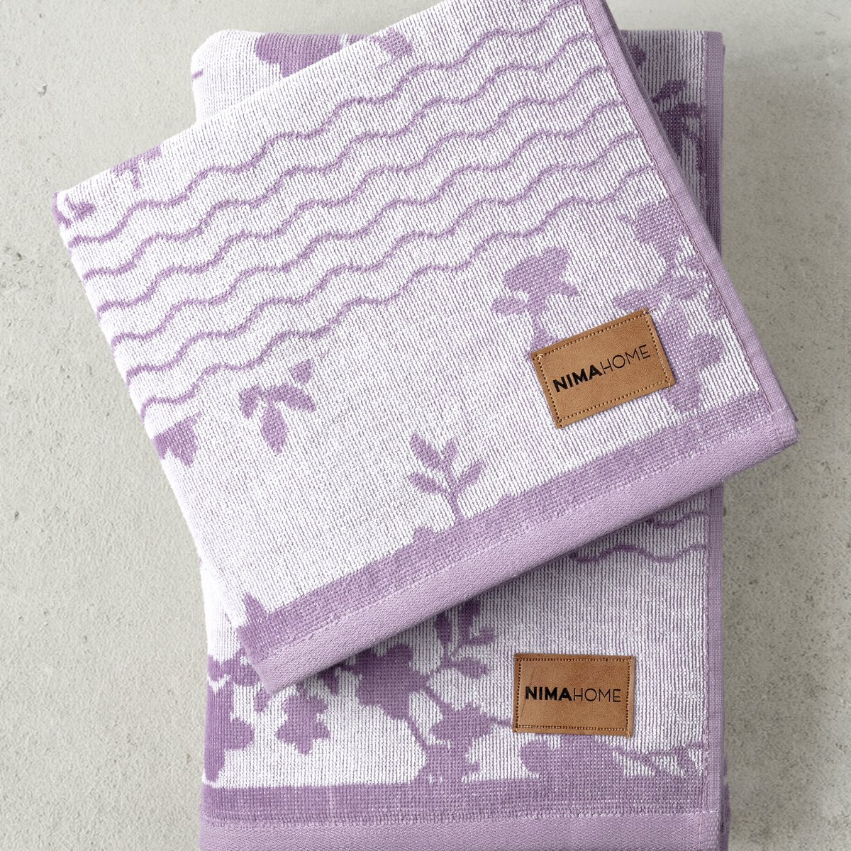 Σετ πετσέτες 2τμχ σε λιλά χρώμα, με εκρού λεπτομέρειες και φλοράλ σχέδιο από την εταιρεία Nima.Το ύφασμα είναι jacquard σύνθεσης 100% βαμβάκι βάρους 480gsm που τις καθιστά απαλές και απορροφητικές. Στολίστε το μπάνιο σας με στυλ και ποιότητα. Συνδυάστε την με τις υπόλοιπες διαστάσεις του ίδιου σχεδίου για ένα ολοκληρωμένο αποτέλεσμα στο μπάνιο σας.
