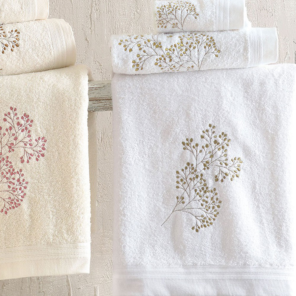 Πετσέτες μπάνιου σετ 3 τεμαχίων από την εταιρεία Rythmos σε λευκό χρώμα με λαδί κεντητές λεπτομέρειες. Είναι κατασκευασμένες από 100% βαμβάκι βάρους 470gsm, που τις καθιστά απαλές και απορροφητικές. Ιδανικό σετ για να στολίσετε το μπάνιο σας με ποιότητα και στυλ. Με δυνατότητα επιλογής σε συσκευασία σακούλα ή κουτί.