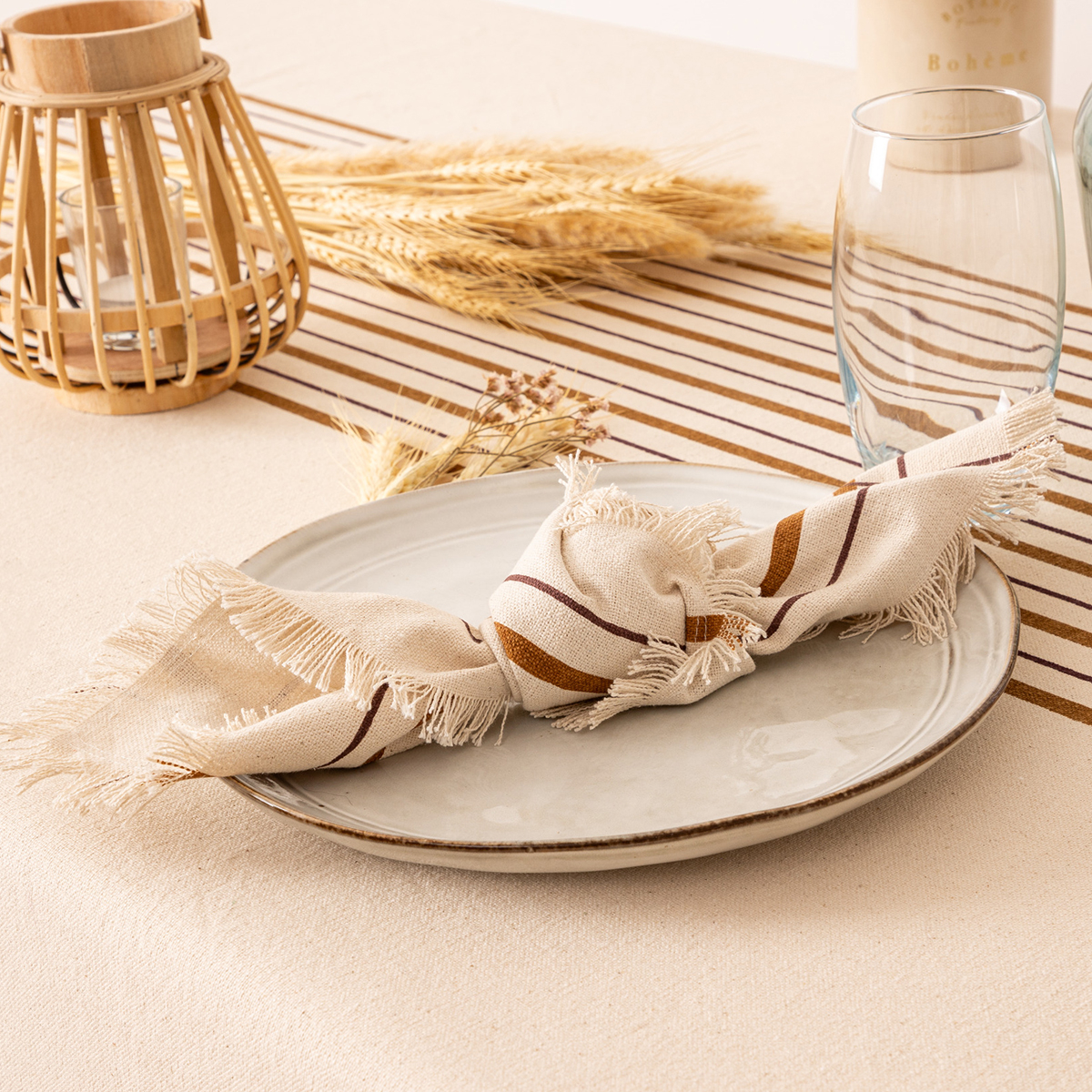Πετσέτες φαγητού σε εκρού χρώμα με περιμετρικό ριγέ σχέδιο σε μπεζ-καφέ αποχρώσεις Το σετ περιλαμβάνει 2 πετσέτες, κατασκευασμένες από 100% βαμβάκι. Ιδανικές για να δώσετε χαρακτήρα και αέρα πολυτέλειας στα εορταστικά σας τραπέζια ή στην καθημερινότητά σας. Συνδυάστε τις με τα υπόλοιπα είδη της ίδιας συλλογής για ένα ολοκληρωμένο αποτέλεσμα στον χώρο σας.