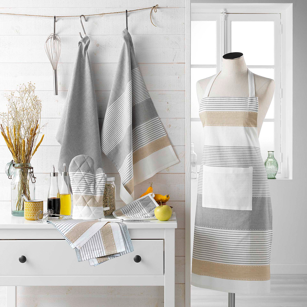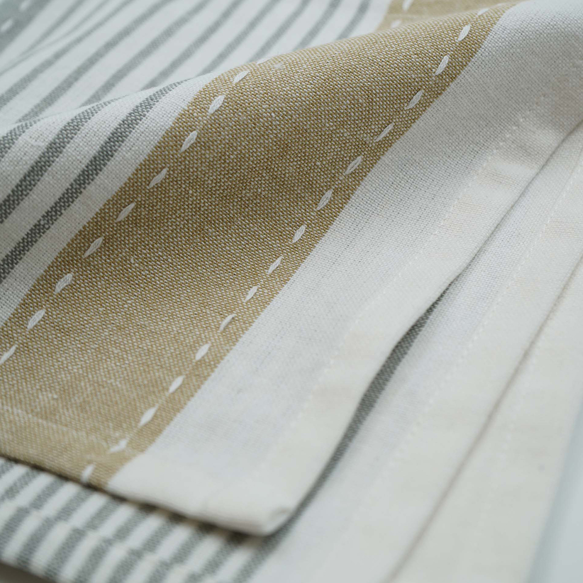 Πετσέτες φαγητού σε λευκό χρώμα με γκρι -μπεζ λεπτομέρειες και ριγέ σχέδιο. Το ύφασμα είναι από 66% βαμβάκι και 34% polyester. Συνδυάστε τες με τα υπόλοιπα είδη της ίδιας συλλογής για να ένα εντυπωσιακό αποτέλεσμα.