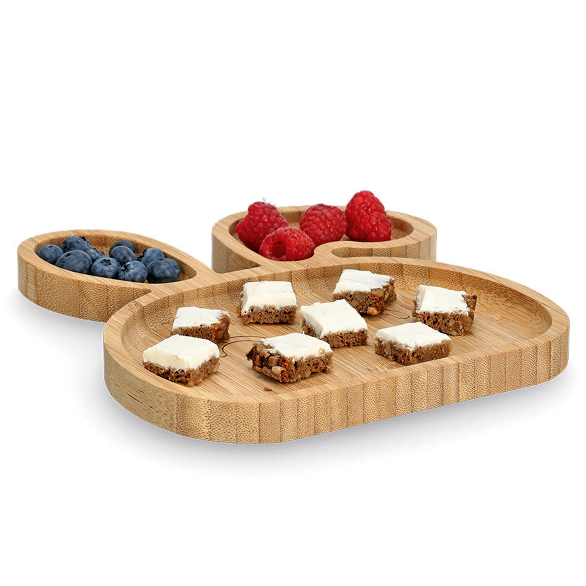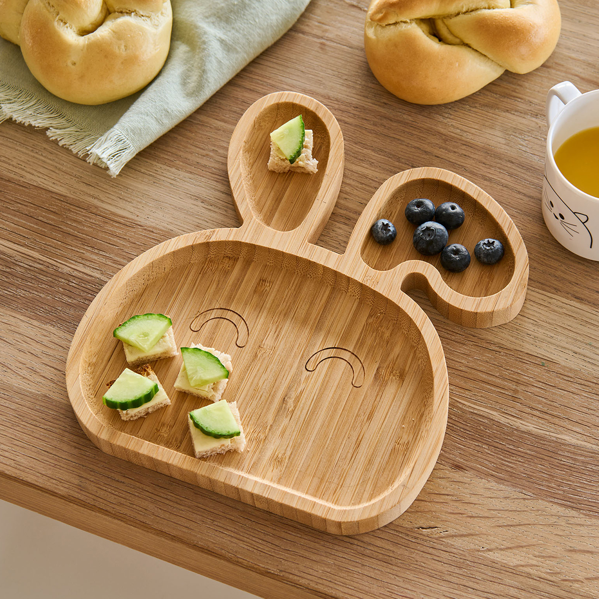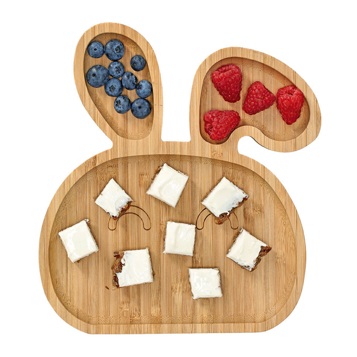 Πιάτο φαγητού σε σχήμα κουνελάκι. Είναι κατασκευασμένο από ξύλο bamboo, κατάλληλο για τρόφιμα. Το bamboo είναι ένα ιδιαίτερα ελαφρύ, ανθεκτικό υλικό με αντιβακτηριδιακή δράση και φιλικό προς το περιβάλλον. Σε αντίθεση με το παραδοσιακό ξύλο, το μπαμπού είναι πιο ανθεκτικό στα σημάδια των μαχαιριών και στην υγρασία. Είναι ιδανικό για μικρά σνακ ή παιδικά γεύματα ενώ τα χωρίσματά του σας επιτρέπουν να τοποθετήσετε διαφορετικές παρασκευές χωρίς να ανακατευτούν μεταξύ τους. Με πιστοποίηση 100% FSC.