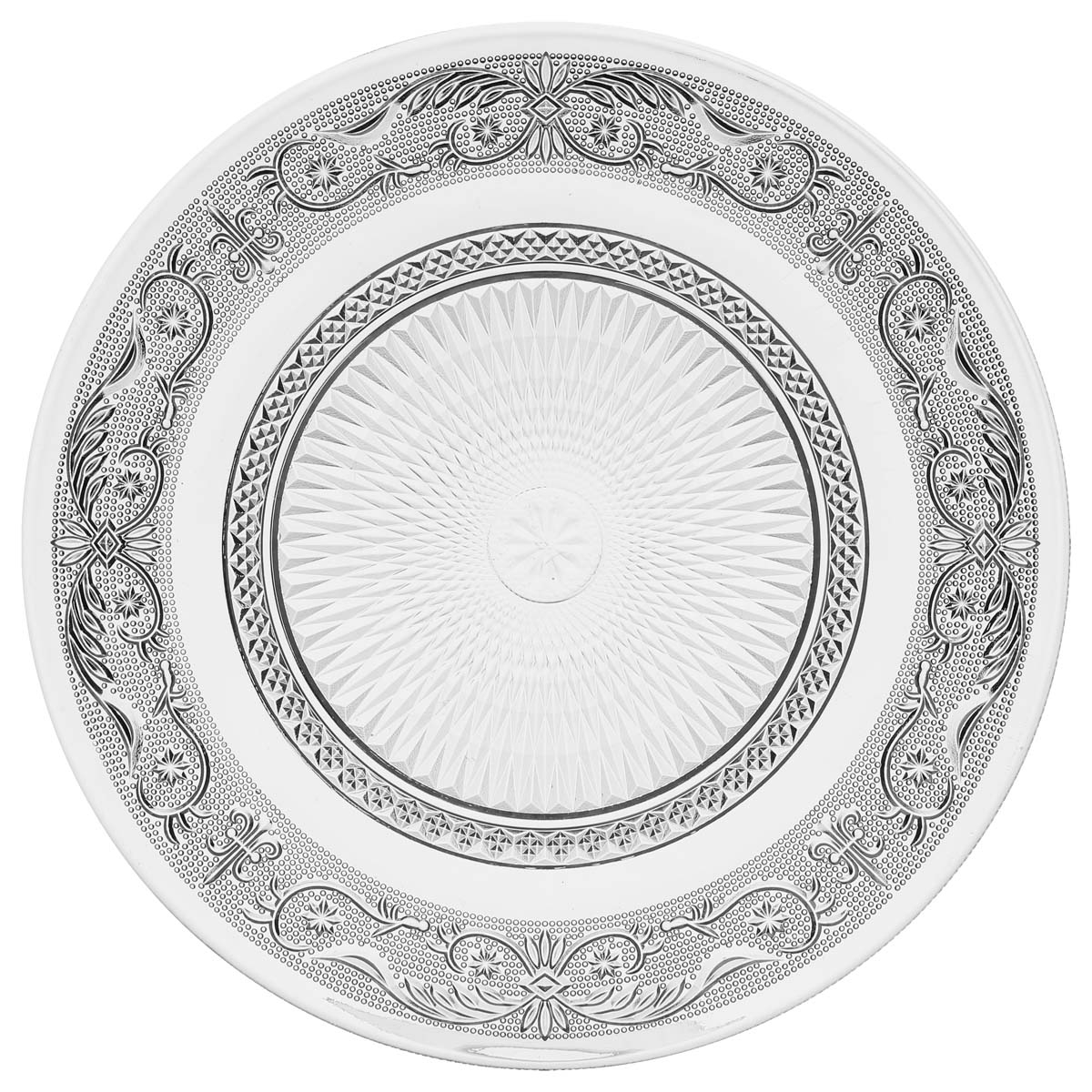 Ρηχό πιάτο φαγητού με vintage σχεδιασμό και ανάγλυφη εξωτερική επιφάνεια. Είναι κατασκευασμένο από διάφανο γυαλί. Ιδανικό για να δώσει μία ιδιαίτερη πινελιά στο τραπέζι σας.