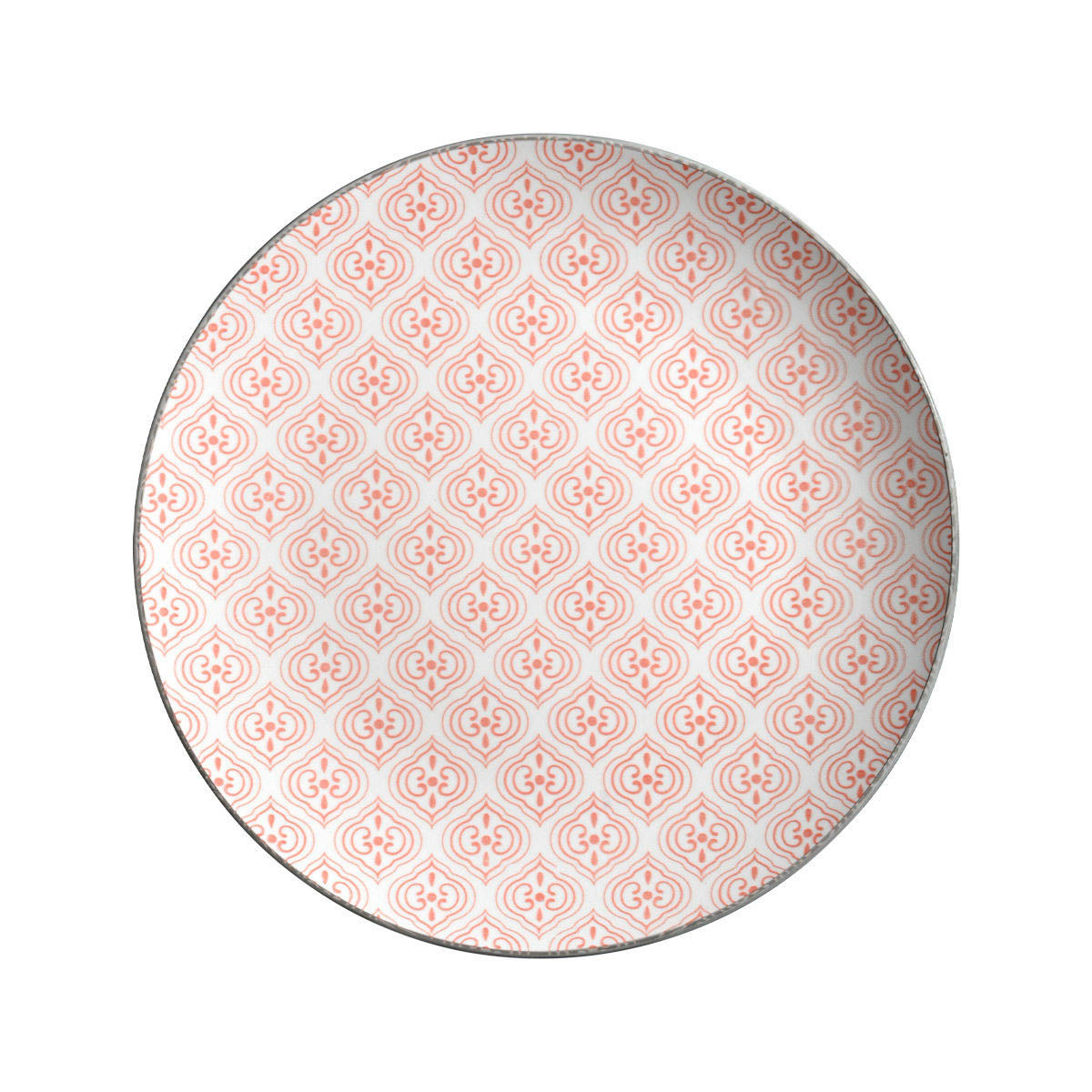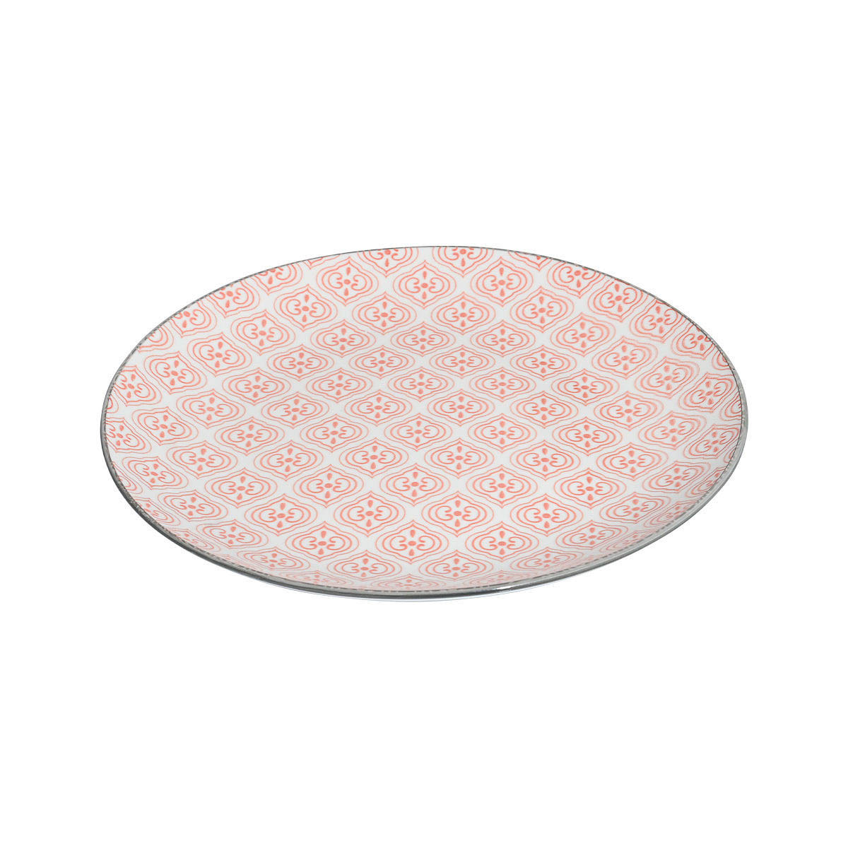 Ρηχό πιάτο φαγητού από την εταιρεία εstia σε λευκό χρώμα με κοραλί λεπτομέρειες στο σχέδιο. Είναι κατασκευασμένο από πορσελάνη. Συνδυάστε το με τα υπόλοιπα είδη της ίδιας σειράς για ένα ολοκληρωμένο σετ.