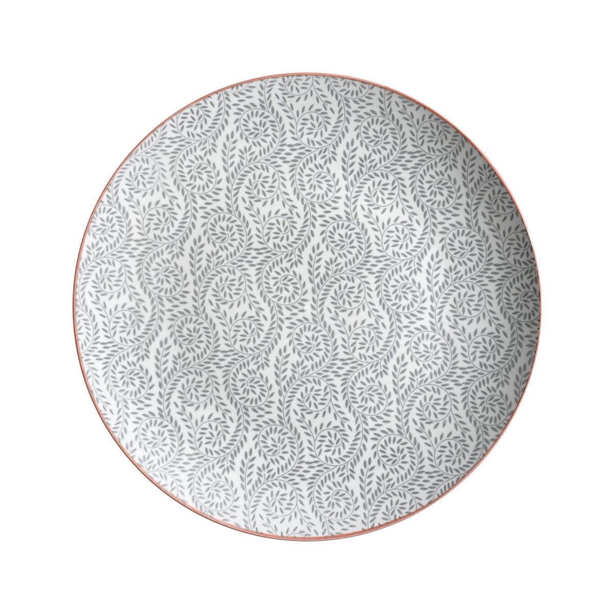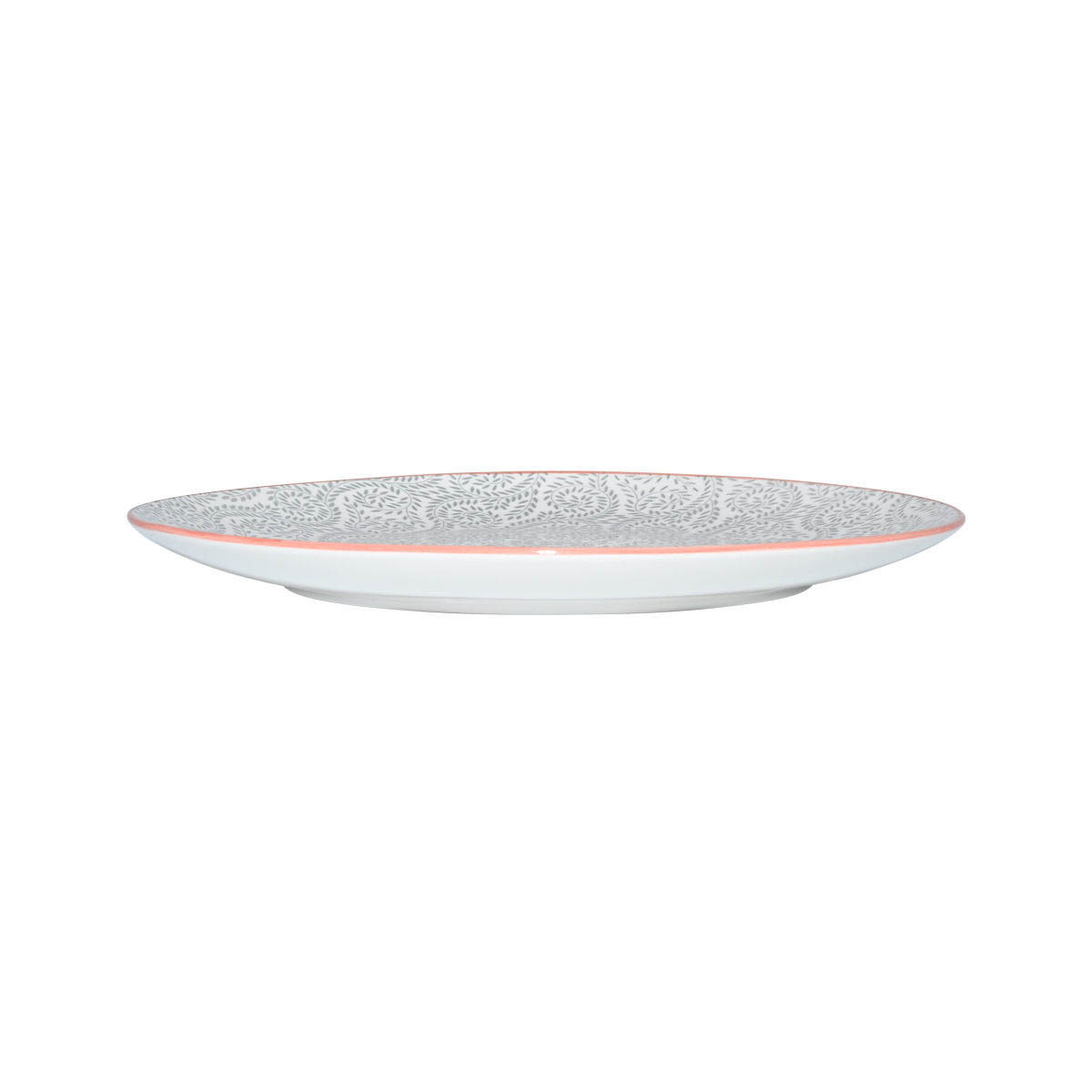Ρηχό πιάτο φαγητού από την εταιρεία εstia σε λευκό χρώμα με γκρι φλοράλ σχέδιο. Περιμετρικά έχει κοραλί χείλος. Είναι κατασκευασμένο από πορσελάνη. Συνδυάστε το με τα υπόλοιπα είδη της ίδιας σειράς για ένα ολοκληρωμένο σετ.
