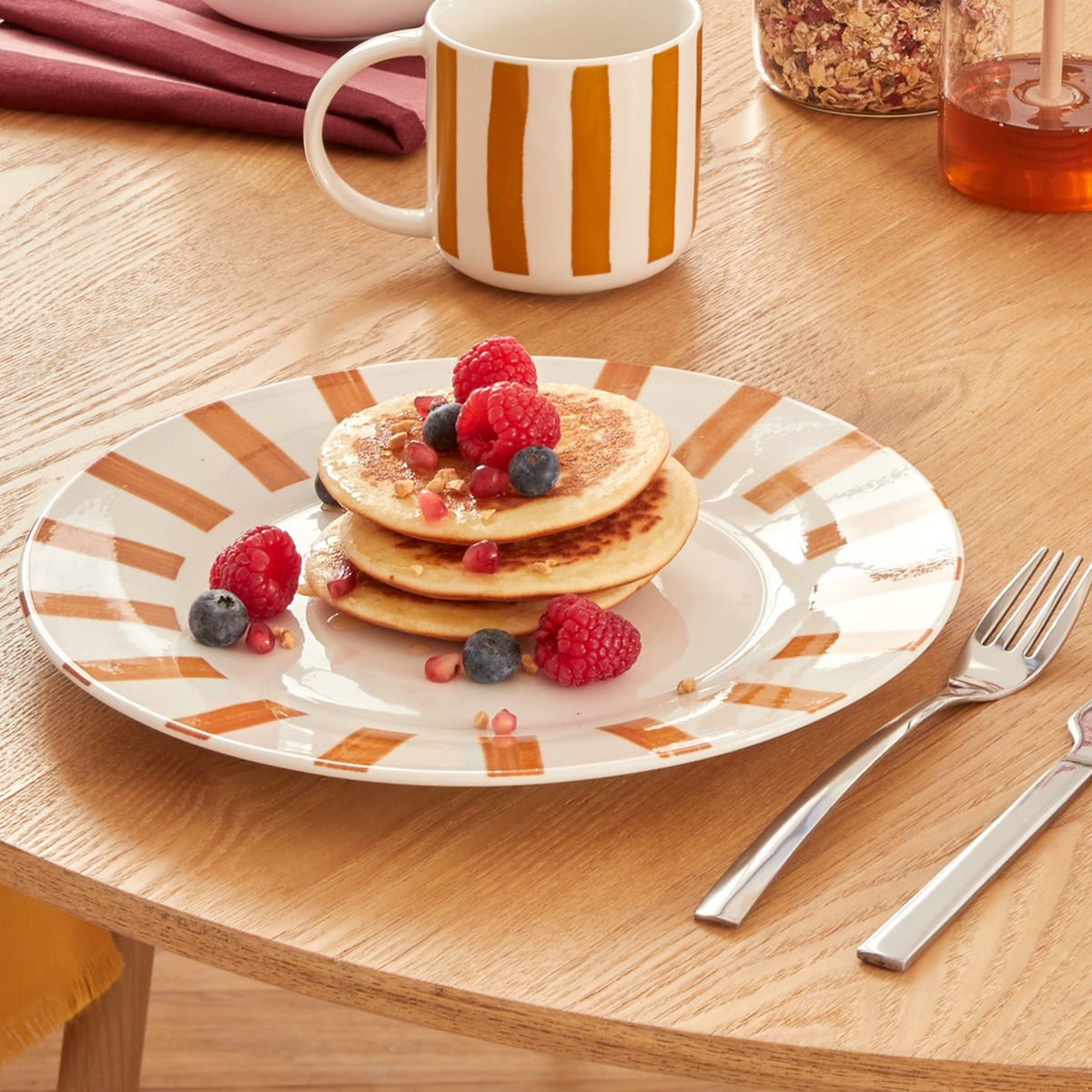 Ρηχό πιάτο φαγητού σε λευκό χρώμα με μοντέρνο σχέδιο στο χρώμα της ώχρας, κατασκευασμένο από πορσελάνη. Η πορσελάνη είναι μη πορώδες υλικό, πράγμα που σημαίνει ότι δεν απορροφά υγρά ή οσμές. Αυτή της η ιδιότητα την καθιστά ιδανική για τρόφιμα και ροφήματα, καθώς είναι εύκολο να καθαριστεί και να διατηρηθεί χωρίς λεκέδες ή μυρωδιές. Ιδανικό πιάτο για να απολαύσετε το φαγητό σας. Συνδυάστε το με τα υπόλοιπα είδη του ίδιου σχεδίου για ένα ολοκληρωμένο αποτέλεσμα.