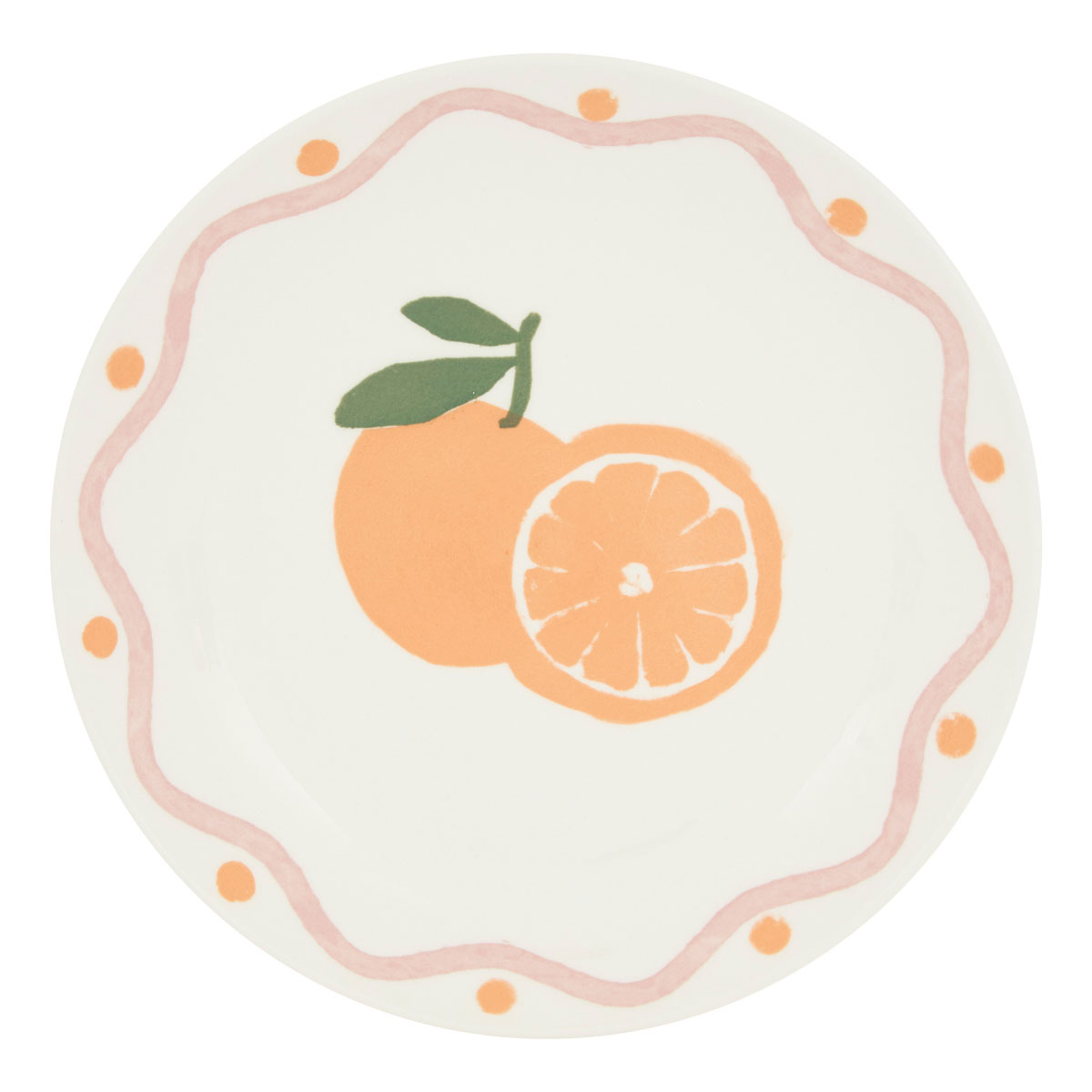 Πιάτο γλυκού/φρούτου σε λευκό-σομόν χρώμα με πράσινες-ροζ λεπτομέρειες και σχέδιο πορτοκάλι, ιδανικό για φρούτα ή σνακ. Είναι κατασκευασμένο από πορσελάνη κατάλληλη για τρόφιμα που συμβάλλει στην διατήρηση της θερμοκρασίας του περιεχομένου για περισσότερη ώρα. Η μη πορώδης επιφάνεια δεν απορροφά υγρασία ή οσμές. Συνδυάστε το με τα υπόλοιπα είδη της ίδιας σειράς για ένα ολοκληρωμένο αποτέλεσμα.