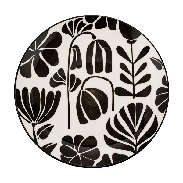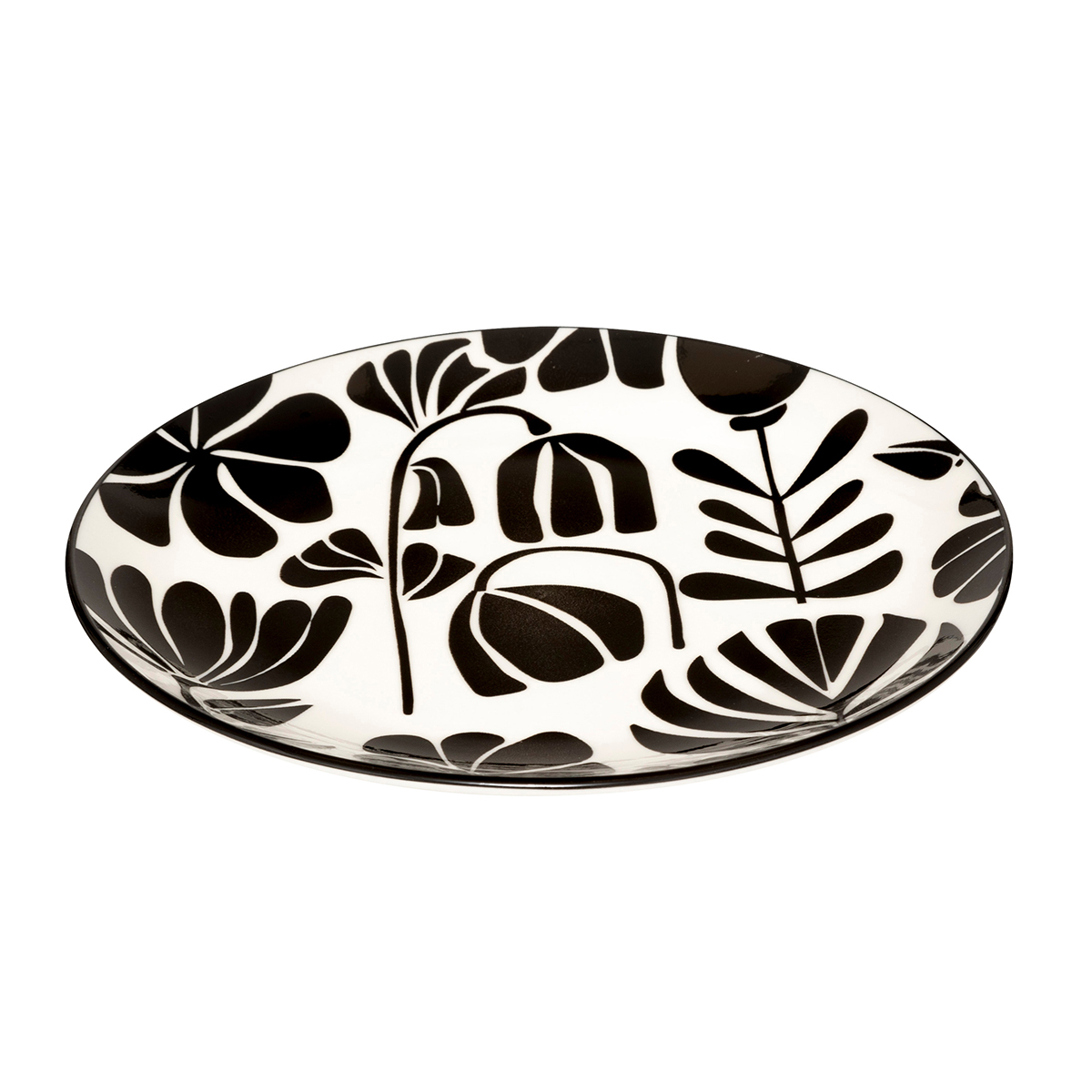 Πιάτο φρούτου ή γλυκού σε λευκό χρώμα με μαύρο φλοράλ σχέδιο, κατασκευασμένο από πορσελάνη. Η πορσελάνη είναι μη πορώδης υλικό, πράγμα που σημαίνει ότι δεν απορροφά υγρά ή οσμές. Αυτή της η ιδιότητα την καθιστά ιδανική για τρόφιμα και ροφήματα, καθώς είναι εύκολο να καθαριστεί και να διατηρηθεί χωρίς λεκέδες ή μυρωδιές. Ιδανικό πιάτο για να απολαύσετε το επιδόρπιο σας. Συνδυάστε το με τα υπόλοιπα είδη του ίδιου σχεδίου για ένα ολοκληρωμένο αποτέλεσμα.