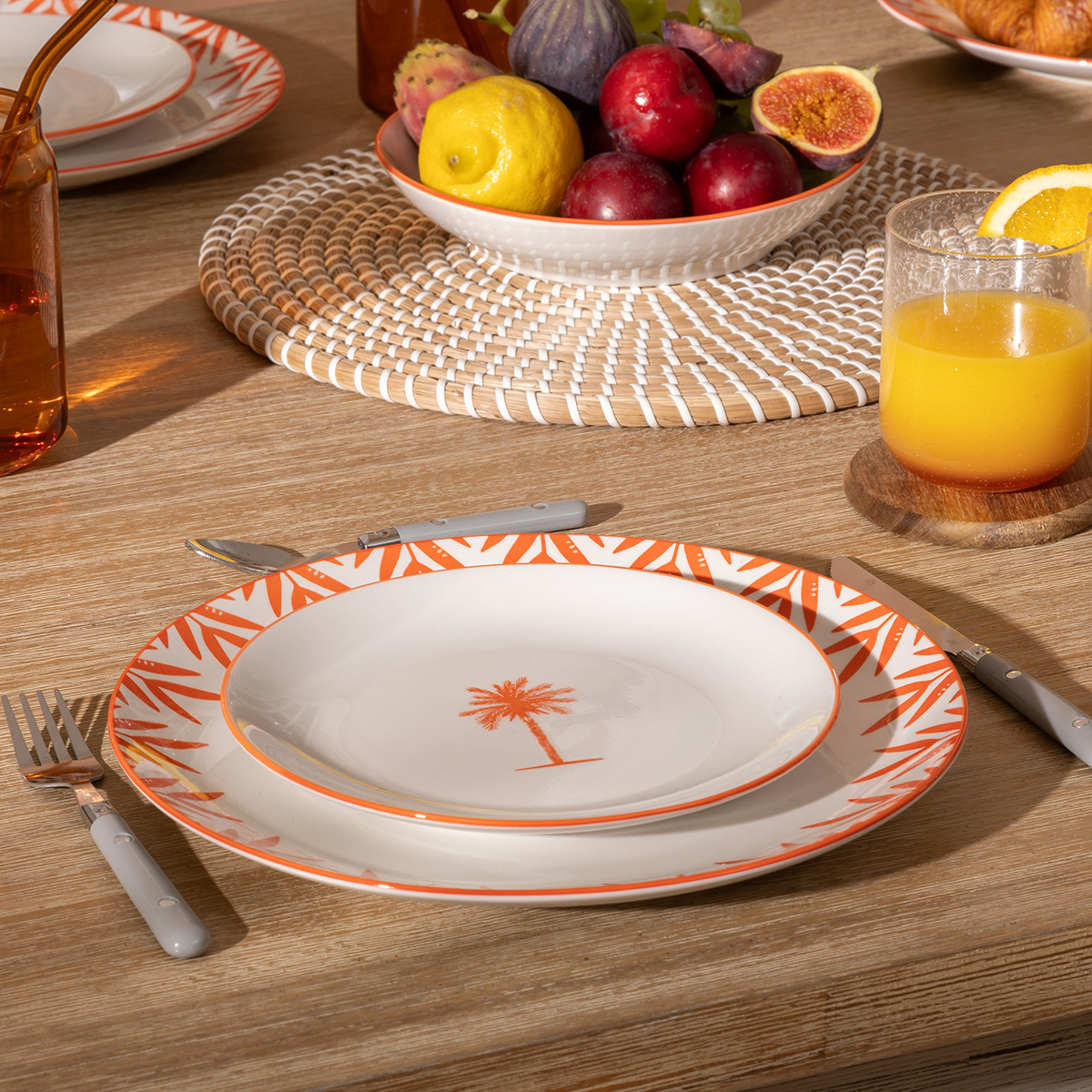 Πιάτο φρούτου ή γλυκού σε λευκό χρώμα με πορτοκαλί μοντέρνο σχέδιο, κατασκευασμένο από πορσελάνη. Η πορσελάνη είναι μη πορώδης υλικό, πράγμα που σημαίνει ότι δεν απορροφά υγρά ή οσμές. Αυτή της η ιδιότητα την καθιστά ιδανική για τρόφιμα και ροφήματα, καθώς είναι εύκολο να καθαριστεί και να διατηρηθεί χωρίς λεκέδες ή μυρωδιές. Ιδανικό πιάτο για να απολαύσετε το επιδόρπιο σας. Συνδυάστε το με τα υπόλοιπα είδη του ίδιου σχεδίου για ένα ολοκληρωμένο αποτέλεσμα.