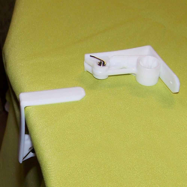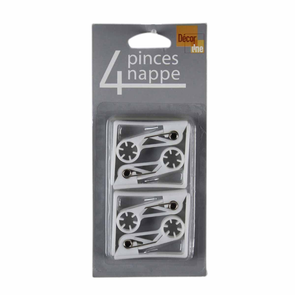 Σετ κλιπς τραπεζομάντηλου κατασκευασμένα από λευκό πλαστικό. Τοποθετούνται στις 4 μεριές του τραπεζιού για να μείνει σταθερό το τραπεζομάντηλο και να μην μετακινείται από την χρήση ή τον αέρα.