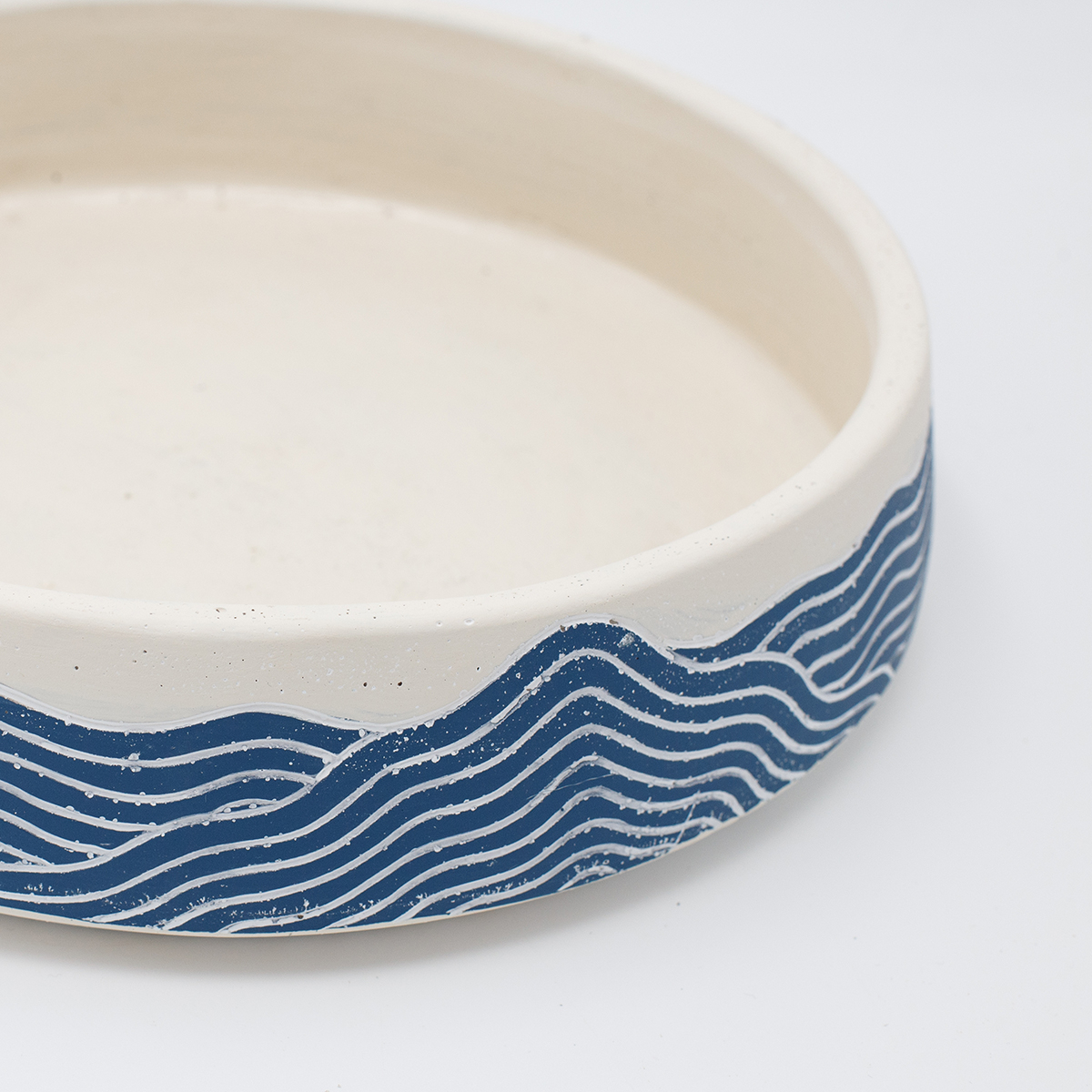 Πιατέλα διακόσμησης της εταιρείας Estheti σε λευκό χρώμα με μπλε μοντέρνο σχέδιο. Είναι κατασκευασμένη από τσιμέντο. Ιδανική για να διακοσμήσετε το σπίτι σας και να δώσετε μια ιδιαίτερη πινελιά στην τραπεζαρία σας. Τοποθετείστε σε κάποιο ράφι για να αναδείξετε την κομψότητα του χώρου σας.