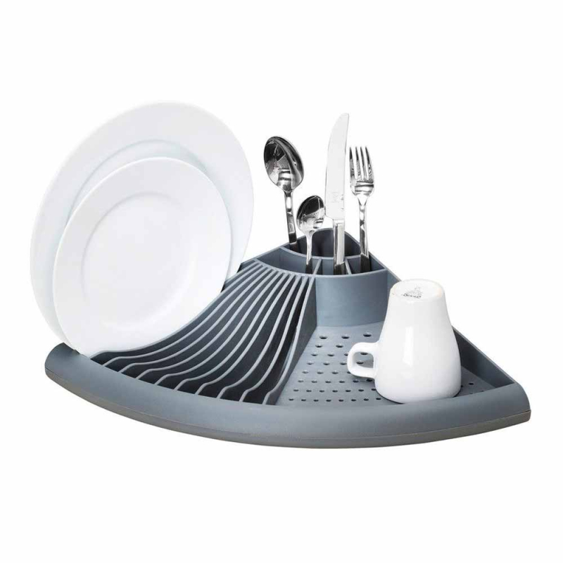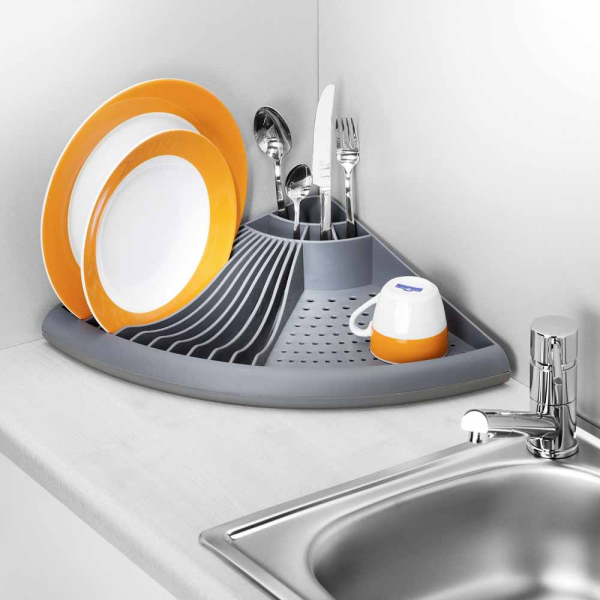 Γωνιακή πιατοθήκη της γερμανικής εταιρείας Wenko. Είναι κατασκευασμένη από πλαστικό σε γκρι χρώμα. Είναι κατάλληλη για τοποθέτηση σε γωνία και κρατά στεγνό τον πάγκο. Στην κάτω μεριά διαθέτει αφαιρούμενο δίσκο αποστράγγισης. Χωράει πιάτα, ποτήρια, κούπες, μαχαιροπήρουνα, κλπ