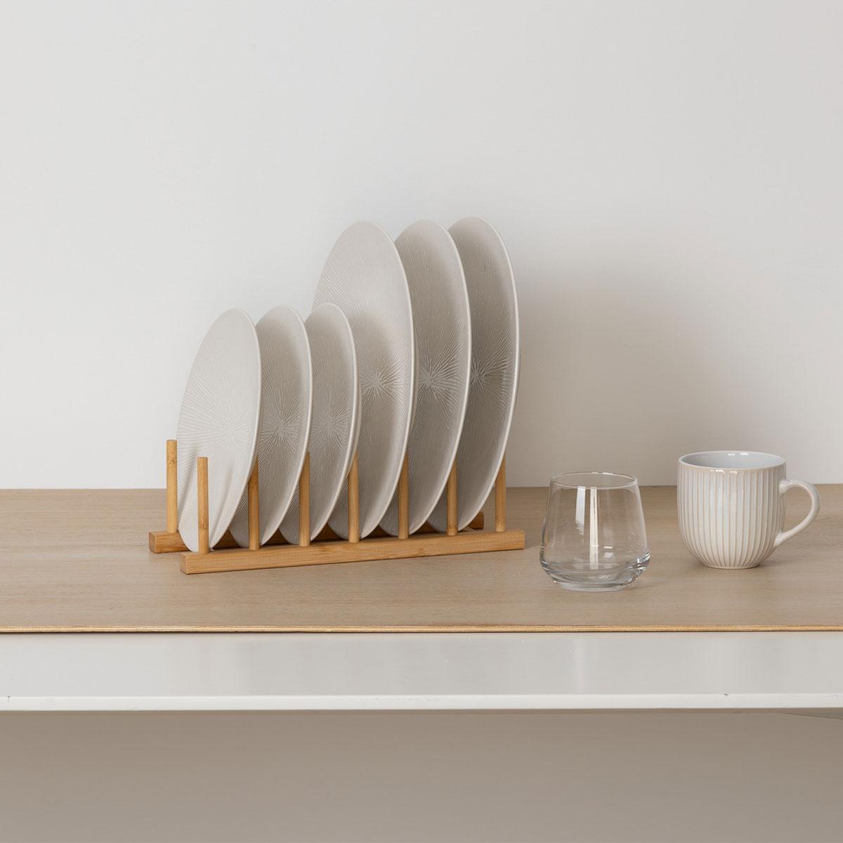 Πιατοθήκη - στραγγιστήρι για τα πιάτα της κουζίνας σας. Είναι κατασκευασμένη από ξύλο bamboo σε μπεζ χρώμα με μίνιμαλ αισθητική. Έχει χώρο για 6 πιάτα.