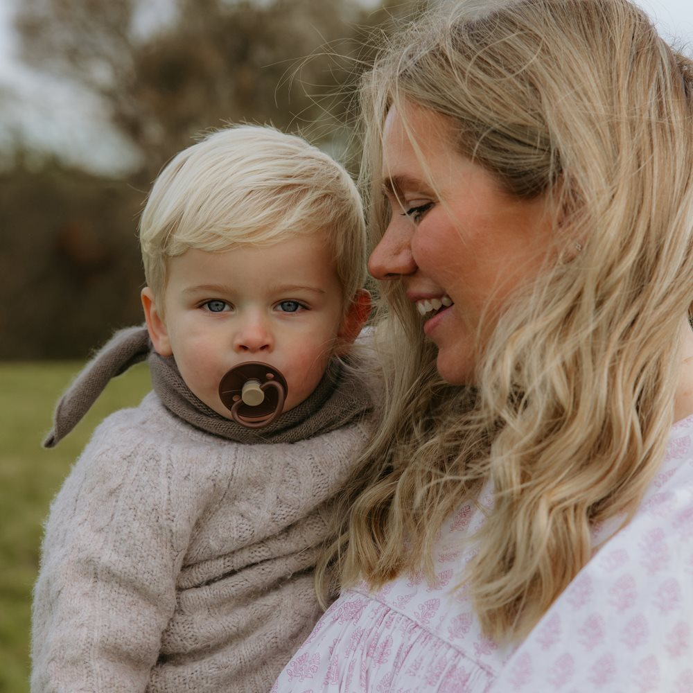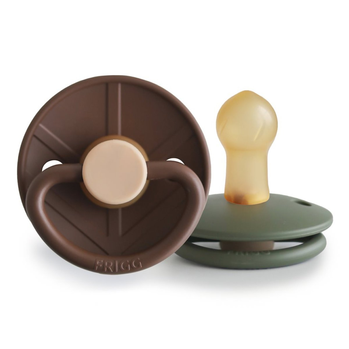 Πιπίλες φυσιολογικές από την εταιρεία Frigg σε χακί και καφέ χρώμα. Είναι κατασκευασμένες η ασπίδα από 100% πολυπροπυλένιο και τη θηλή από 100% φυσικό καουτσούκ. Είναι απαλλαγμένες από BPA, BPS, PVC και φθαλικές ενώσεις. Ο σχεδιασμός τους βασίζεται στην ανατομία του στήθους μιας μητέρας, τόσο σε σχήμα όσο και σε υλικό. Όταν το παιδί πιπιλάει μια στρογγυλή πιπίλα, κυλάει τη γλώσσα του γύρω της με τον ίδιο τρόπο με τον οποίο θηλάζει. Η εταιρεία Frigg έχει ένα πατενταρισμένο σύστημα Click-lock® για τη συναρμολόγηση των πιπιλών, που εξασφαλίζει ότι τα κομμάτια είναι απόλυτα σταθερά και δεν αποσπώνται. Έτσι ελαχιστοποιεί τον κίνδυνο πνιγμού από μικρά κομμάτια, καθώς η πιπίλα είναι εξαιρετικά ανθεκτική. Πριν χρησιμοποιηθεί η πιπίλα για πρώτη φορά θα πρέπει να αποστειρωθεί. Καθαρίζεται εύκολα και αποστειρώνεται σε βραστό νερό. Δοκιμασμένο και εγκεκριμένο προϊόν σύμφωνα με το ευρωπαϊκό πρότυπο ασφαλείας EN1400 + A2. Μέτρο θηλής: 27mm.