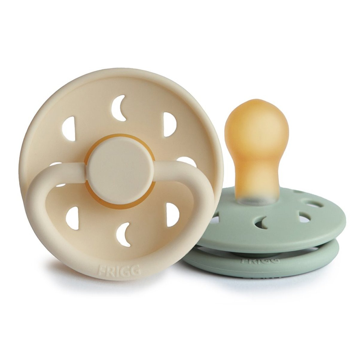 Πιπίλες φυσιολογικές από την εταιρεία Frigg σε εκρού και γαλάζιο χρώμα με φεγγαράκια στην βάση. Είναι κατασκευασμένες η ασπίδα από 100% πολυπροπυλένιο και τη θηλή από 100% φυσικό καουτσούκ. Είναι απαλλαγμένες από BPA, BPS, PVC και φθαλικές ενώσεις. Ο σχεδιασμός τους βασίζεται στην ανατομία του στήθους μιας μητέρας, τόσο σε σχήμα όσο και σε υλικό. Όταν το παιδί πιπιλάει μια στρογγυλή πιπίλα, κυλάει τη γλώσσα του γύρω της με τον ίδιο τρόπο με τον οποίο θηλάζει. Η εταιρεία Frigg έχει ένα πατενταρισμένο σύστημα Click-lock® για τη συναρμολόγηση των πιπιλών, που εξασφαλίζει ότι τα κομμάτια είναι απόλυτα σταθερά και δεν αποσπώνται. Έτσι ελαχιστοποιεί τον κίνδυνο πνιγμού από μικρά κομμάτια, καθώς η πιπίλα είναι εξαιρετικά ανθεκτική. Πριν χρησιμοποιηθεί η πιπίλα για πρώτη φορά θα πρέπει να αποστειρωθεί. Καθαρίζεται εύκολα και αποστειρώνεται σε βραστό νερό. Δοκιμασμένο και εγκεκριμένο προϊόν σύμφωνα με το ευρωπαϊκό πρότυπο ασφαλείας EN1400 + A2. Μέτρο θηλής: 27mm.