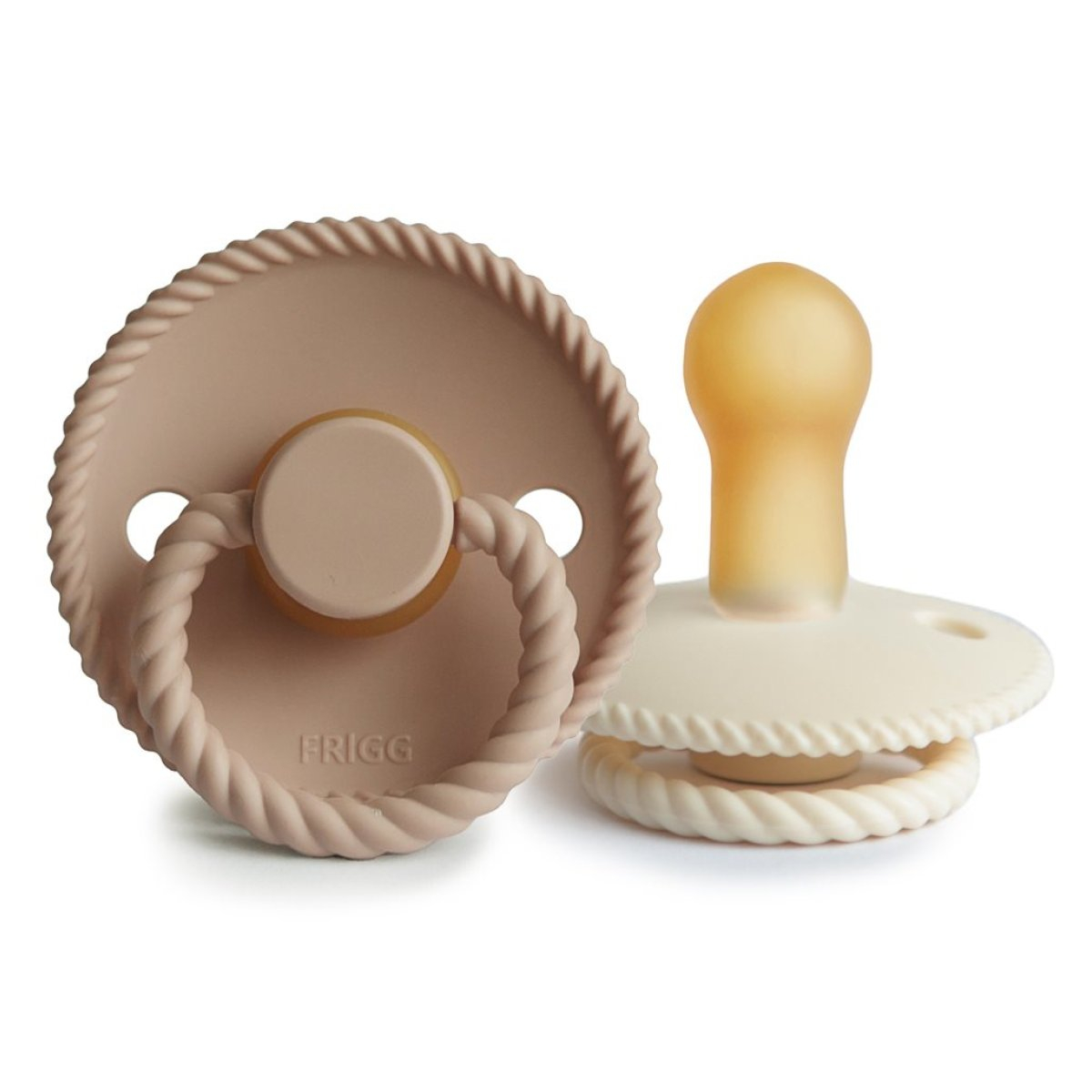 Πιπίλες φυσιολογικές από την εταιρεία Frigg σε εκρού και μπεζ χρώμα. Είναι κατασκευασμένες η ασπίδα από 100% πολυπροπυλένιο και τη θηλή από 100% φυσικό καουτσούκ. Είναι απαλλαγμένες από BPA, BPS, PVC και φθαλικές ενώσεις. Ο σχεδιασμός τους βασίζεται στην ανατομία του στήθους μιας μητέρας, τόσο σε σχήμα όσο και σε υλικό. Όταν το παιδί πιπιλάει μια στρογγυλή πιπίλα, κυλάει τη γλώσσα του γύρω της με τον ίδιο τρόπο με τον οποίο θηλάζει. Η εταιρεία Frigg έχει ένα πατενταρισμένο σύστημα Click-lock® για τη συναρμολόγηση των πιπιλών, που εξασφαλίζει ότι τα κομμάτια είναι απόλυτα σταθερά και δεν αποσπώνται. Έτσι ελαχιστοποιεί τον κίνδυνο πνιγμού από μικρά κομμάτια, καθώς η πιπίλα είναι εξαιρετικά ανθεκτική. Πριν χρησιμοποιηθεί η πιπίλα για πρώτη φορά θα πρέπει να αποστειρωθεί. Καθαρίζεται εύκολα και αποστειρώνεται σε βραστό νερό. Δοκιμασμένο και εγκεκριμένο προϊόν σύμφωνα με το ευρωπαϊκό πρότυπο ασφαλείας EN1400 + A2. Μέτρο θηλής: 30mm.