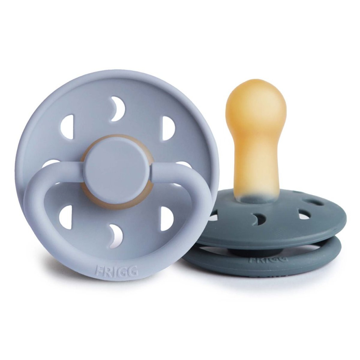 Πιπίλες φυσιολογικές από την εταιρεία Frigg σε μπλε και γκρι χρώμα με φεγγαράκια στην βάση. Είναι κατασκευασμένες η ασπίδα από 100% πολυπροπυλένιο και τη θηλή από 100% φυσικό καουτσούκ. Είναι απαλλαγμένες από BPA, BPS, PVC και φθαλικές ενώσεις. Ο σχεδιασμός τους βασίζεται στην ανατομία του στήθους μιας μητέρας, τόσο σε σχήμα όσο και σε υλικό. Όταν το παιδί πιπιλάει μια στρογγυλή πιπίλα, κυλάει τη γλώσσα του γύρω της με τον ίδιο τρόπο με τον οποίο θηλάζει. Η εταιρεία Frigg έχει ένα πατενταρισμένο σύστημα Click-lock® για τη συναρμολόγηση των πιπιλών, που εξασφαλίζει ότι τα κομμάτια είναι απόλυτα σταθερά και δεν αποσπώνται. Έτσι ελαχιστοποιεί τον κίνδυνο πνιγμού από μικρά κομμάτια, καθώς η πιπίλα είναι εξαιρετικά ανθεκτική. Πριν χρησιμοποιηθεί η πιπίλα για πρώτη φορά θα πρέπει να αποστειρωθεί. Καθαρίζεται εύκολα και αποστειρώνεται σε βραστό νερό. Δοκιμασμένο και εγκεκριμένο προϊόν σύμφωνα με το ευρωπαϊκό πρότυπο ασφαλείας EN1400 + A2. Μέτρο θηλής: 30mm.
