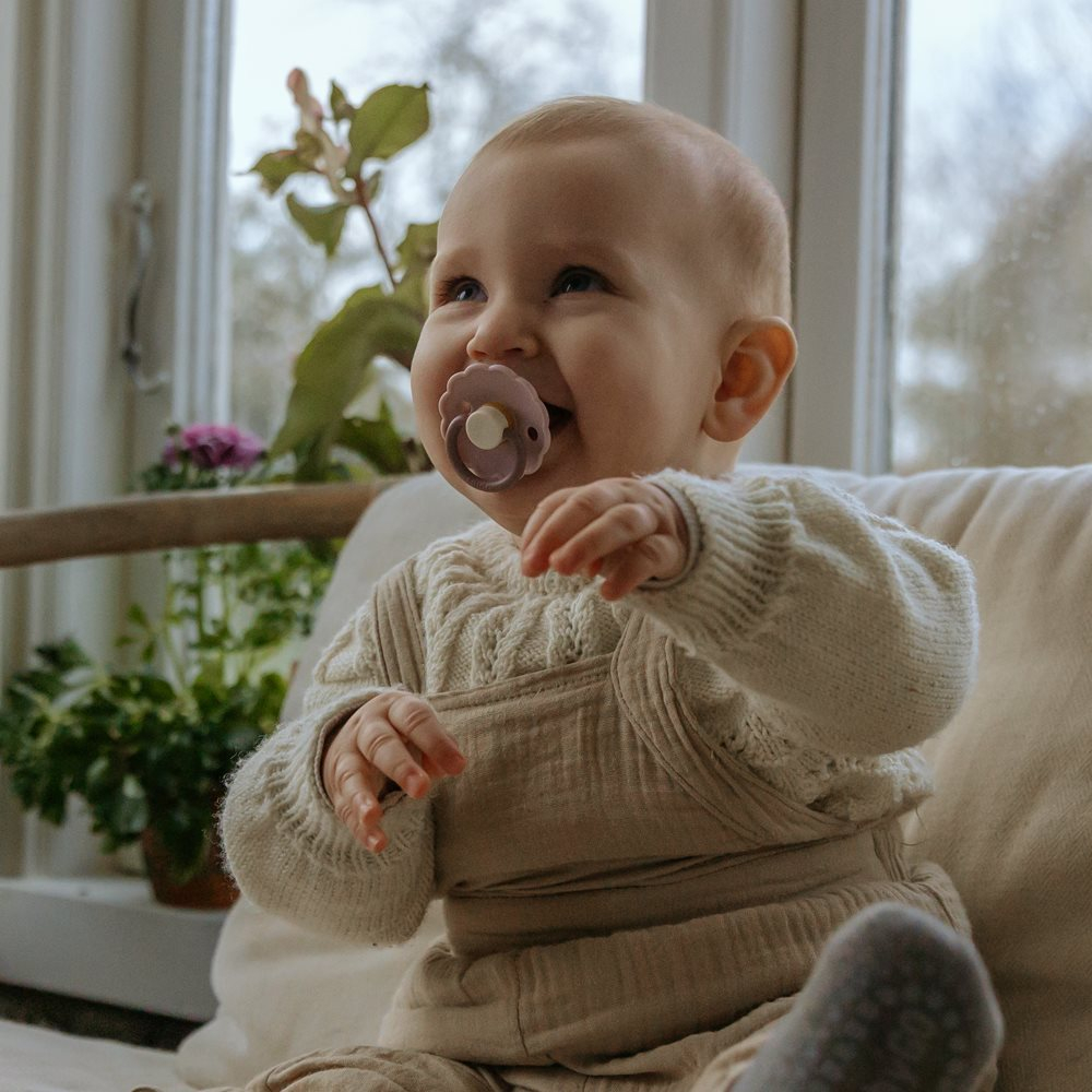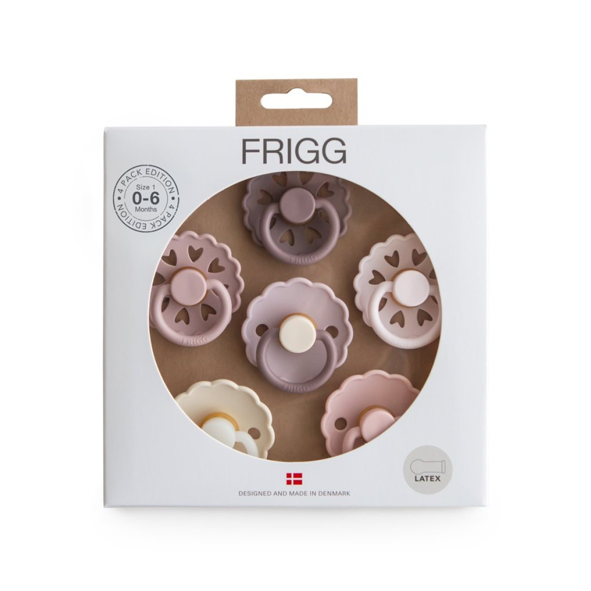 Πιπίλες φυσιολογικές από την εταιρεία Frigg σε ροζ και λιλά αποχρώσεις. Είναι κατασκευασμένες η ασπίδα από 100% πολυπροπυλένιο και τη θηλή από 100% φυσικό καουτσούκ. Είναι απαλλαγμένες από BPA, BPS, PVC και φθαλικές ενώσεις. Ο σχεδιασμός τους βασίζεται στην ανατομία του στήθους μιας μητέρας, τόσο σε σχήμα όσο και σε υλικό. Όταν το παιδί πιπιλάει μια στρογγυλή πιπίλα, κυλάει τη γλώσσα του γύρω της με τον ίδιο τρόπο με τον οποίο θηλάζει. Η εταιρεία Frigg έχει ένα πατενταρισμένο σύστημα Click-lock® για τη συναρμολόγηση των πιπιλών, που εξασφαλίζει ότι τα κομμάτια είναι απόλυτα σταθερά και δεν αποσπώνται. Έτσι ελαχιστοποιεί τον κίνδυνο πνιγμού από μικρά κομμάτια, καθώς η πιπίλα είναι εξαιρετικά ανθεκτική. Πριν χρησιμοποιηθεί η πιπίλα για πρώτη φορά θα πρέπει να αποστειρωθεί. Καθαρίζεται εύκολα και αποστειρώνεται σε βραστό νερό. Δοκιμασμένο και εγκεκριμένο προϊόν σύμφωνα με το ευρωπαϊκό πρότυπο ασφαλείας EN1400 + A2. Μέτρο θηλής: 30mm.