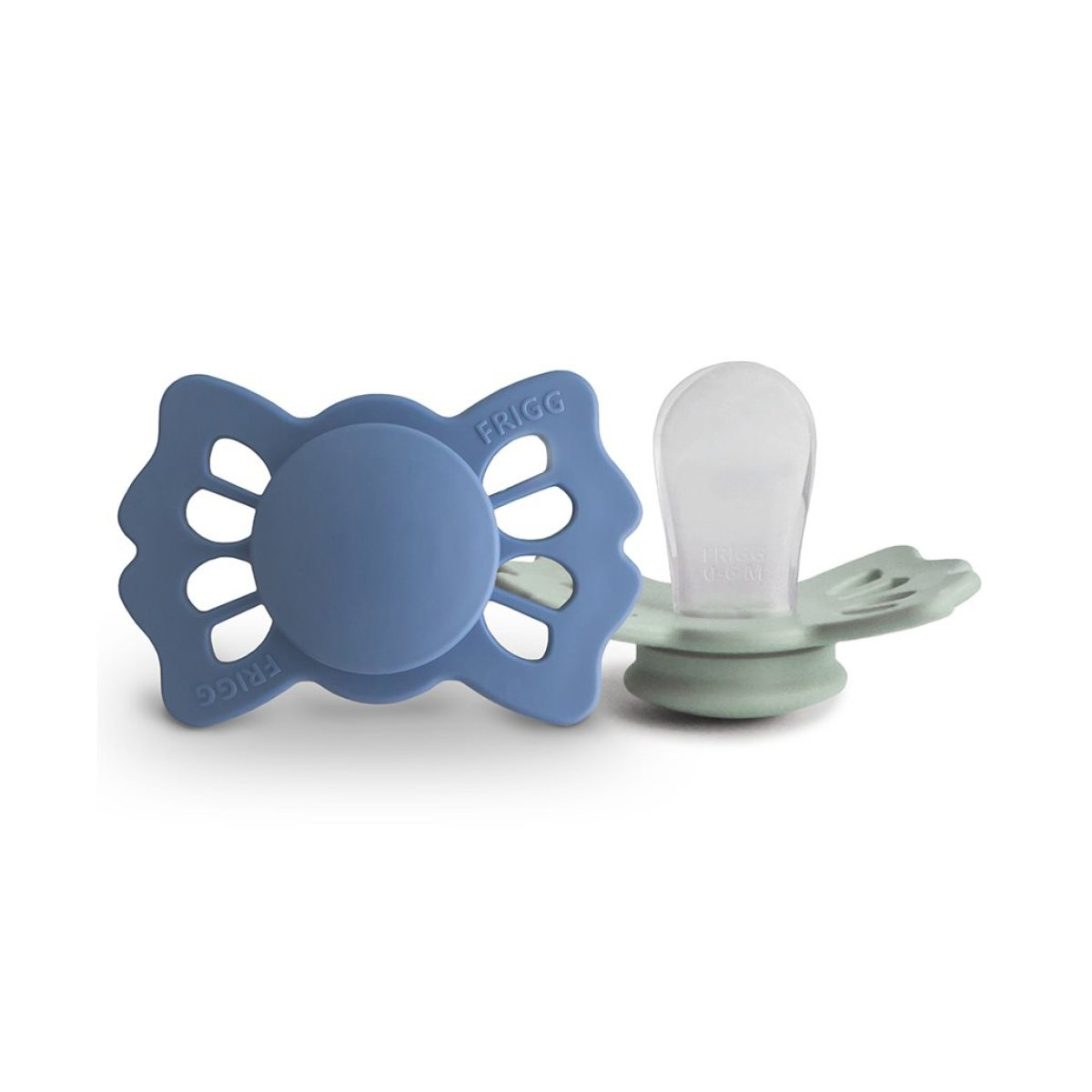 Πιπίλες ανατομικές από την εταιρεία Frigg σε μπλε και πράσινο χρώμα. Η ασπίδα είναι σε σχήμα πεταλούδας. Είναι κατασκευασμένες η ασπίδα από 100% πολυπροπυλένιο και τη θηλή από σιλικόνη ιατρικής ποιότητας. Είναι απαλλαγμένες από BPA, BPS, PVC και φθαλικές ενώσεις. Ο σχεδιασμός τους βασίζεται στην ανατομία του στήθους μιας μητέρας, τόσο σε σχήμα όσο και σε υλικό. Αποτελούνται από μια ειδικά σχεδιασμένη θηλή, η οποία ασκεί λιγότερη πίεση στον ουρανίσκο, στα ούλα και στις γνάθους του μωρού σας. Αυτό μειώνει τον κίνδυνο στραβισμού των δοντιών και της σύγκλεισης. Ο ορθοδοντικός της σχεδιασμός είναι ιδανικός για την υποστήριξη της σωστής ανάπτυξης των δοντιών, της γνάθου και του ουρανίσκου του μωρού. Η εταιρεία Frigg έχει ένα πατενταρισμένο σύστημα Click-lock® για τη συναρμολόγηση των πιπιλών, που εξασφαλίζει ότι τα κομμάτια είναι απόλυτα σταθερά και δεν αποσπώνται. Έτσι ελαχιστοποιεί τον κίνδυνο πνιγμού από μικρά κομμάτια, καθώς η πιπίλα είναι εξαιρετικά ανθεκτική. Πριν χρησιμοποιηθεί η πιπίλα για πρώτη φορά θα πρέπει να αποστειρωθεί. Καθαρίζεται εύκολα και αποστειρώνεται σε βραστό νερό. Δοκιμασμένο και εγκεκριμένο προϊόν σύμφωνα με το ευρωπαϊκό πρότυπο ασφαλείας EN1400 + A2. Μέτρο θηλής: 27mm.