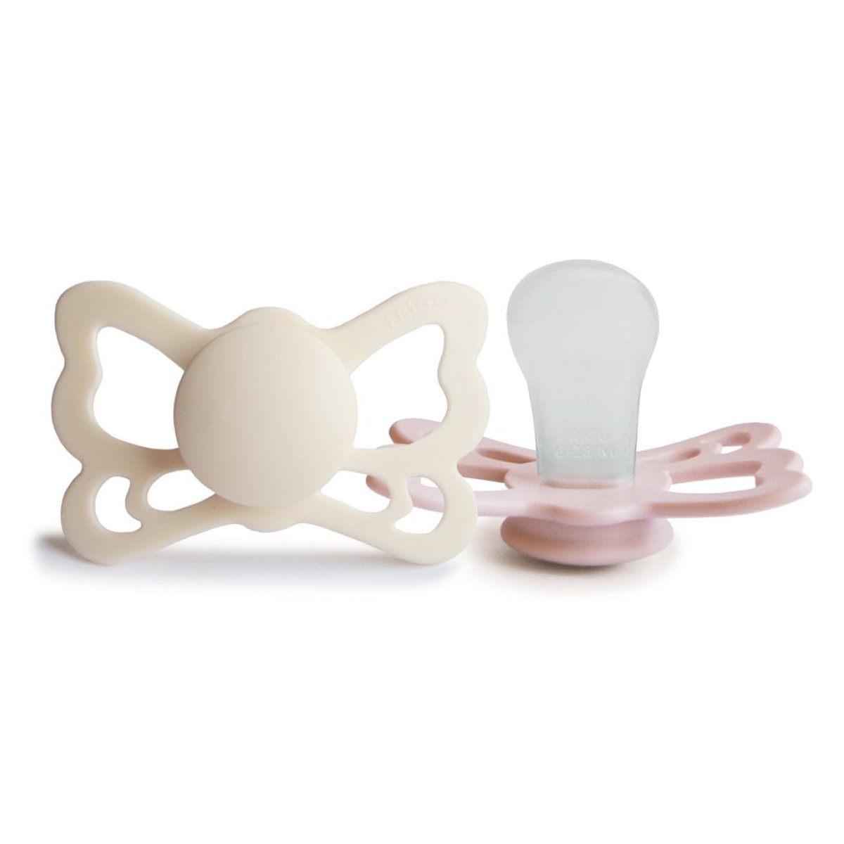 Πιπίλες ανατομικές από την εταιρεία Frigg σε εκρού και ροζ χρώμα. Η ασπίδα είναι σε σχήμα πεταλούδας. Είναι κατασκευασμένες η ασπίδα από 100% πολυπροπυλένιο και τη θηλή από σιλικόνη ιατρικής ποιότητας. Είναι απαλλαγμένες από BPA, BPS, PVC και φθαλικές ενώσεις. Ο σχεδιασμός τους βασίζεται στην ανατομία του στήθους μιας μητέρας, τόσο σε σχήμα όσο και σε υλικό. Αποτελούνται από μια ειδικά σχεδιασμένη θηλή, η οποία ασκεί λιγότερη πίεση στον ουρανίσκο, στα ούλα και στις γνάθους του μωρού σας. Αυτό μειώνει τον κίνδυνο στραβισμού των δοντιών και της σύγκλεισης. Ο ορθοδοντικός της σχεδιασμός είναι ιδανικός για την υποστήριξη της σωστής ανάπτυξης των δοντιών, της γνάθου και του ουρανίσκου του μωρού. Η εταιρεία Frigg έχει ένα πατενταρισμένο σύστημα Click-lock® για τη συναρμολόγηση των πιπιλών, που εξασφαλίζει ότι τα κομμάτια είναι απόλυτα σταθερά και δεν αποσπώνται. Έτσι ελαχιστοποιεί τον κίνδυνο πνιγμού από μικρά κομμάτια, καθώς η πιπίλα είναι εξαιρετικά ανθεκτική. Πριν χρησιμοποιηθεί η πιπίλα για πρώτη φορά θα πρέπει να αποστειρωθεί. Καθαρίζεται εύκολα και αποστειρώνεται σε βραστό νερό. Δοκιμασμένο και εγκεκριμένο προϊόν σύμφωνα με το ευρωπαϊκό πρότυπο ασφαλείας EN1400 + A2. Μέτρο θηλής: 30mm.