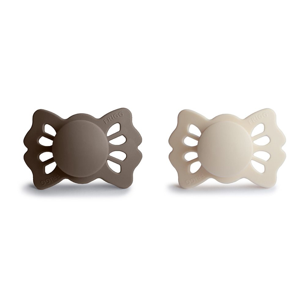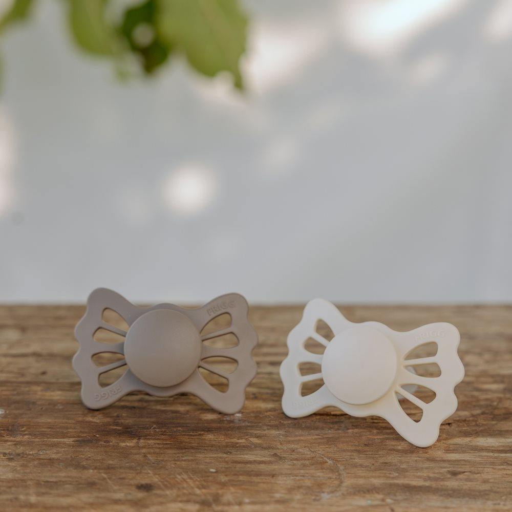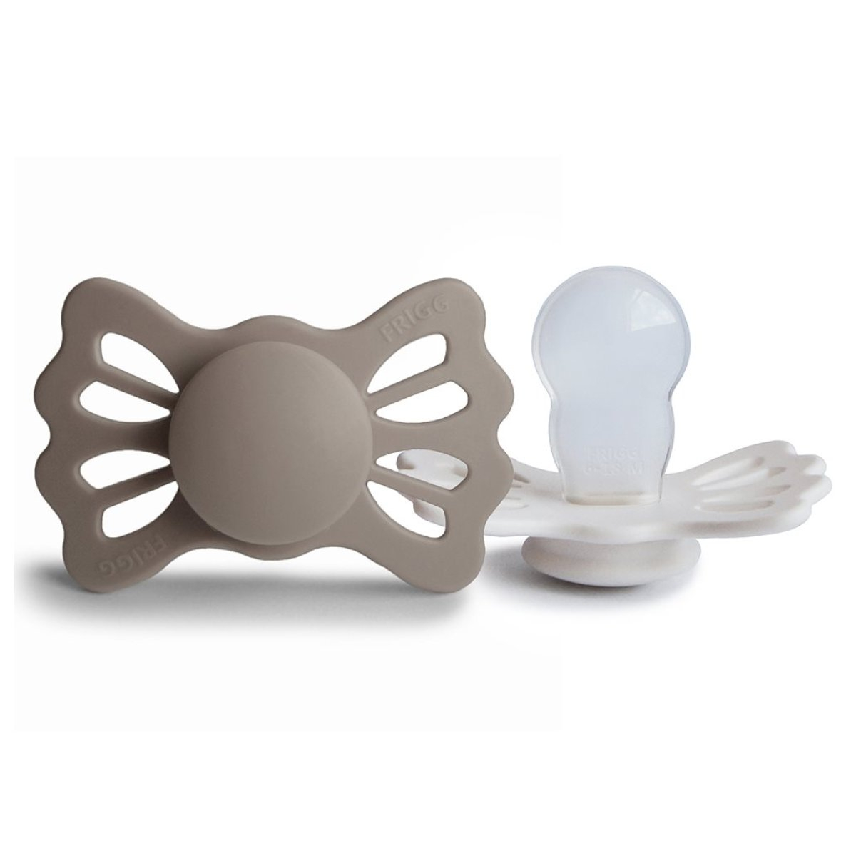 Πιπίλες ανατομικές από την εταιρεία Frigg σε γκρι και εκρού χρώμα. Η ασπίδα είναι σε σχήμα πεταλούδας. Είναι κατασκευασμένες η ασπίδα από 100% πολυπροπυλένιο και τη θηλή από σιλικόνη ιατρικής ποιότητας. Είναι απαλλαγμένες από BPA, BPS, PVC και φθαλικές ενώσεις. Ο σχεδιασμός τους βασίζεται στην ανατομία του στήθους μιας μητέρας, τόσο σε σχήμα όσο και σε υλικό. Αποτελούνται από μια ειδικά σχεδιασμένη θηλή, η οποία ασκεί λιγότερη πίεση στον ουρανίσκο, στα ούλα και στις γνάθους του μωρού σας. Αυτό μειώνει τον κίνδυνο στραβισμού των δοντιών και της σύγκλεισης. Ο ορθοδοντικός της σχεδιασμός είναι ιδανικός για την υποστήριξη της σωστής ανάπτυξης των δοντιών, της γνάθου και του ουρανίσκου του μωρού. Η εταιρεία Frigg έχει ένα πατενταρισμένο σύστημα Click-lock® για τη συναρμολόγηση των πιπιλών, που εξασφαλίζει ότι τα κομμάτια είναι απόλυτα σταθερά και δεν αποσπώνται. Έτσι ελαχιστοποιεί τον κίνδυνο πνιγμού από μικρά κομμάτια, καθώς η πιπίλα είναι εξαιρετικά ανθεκτική. Πριν χρησιμοποιηθεί η πιπίλα για πρώτη φορά θα πρέπει να αποστειρωθεί. Καθαρίζεται εύκολα και αποστειρώνεται σε βραστό νερό. Δοκιμασμένο και εγκεκριμένο προϊόν σύμφωνα με το ευρωπαϊκό πρότυπο ασφαλείας EN1400 + A2. Μέτρο θηλής: 30mm.