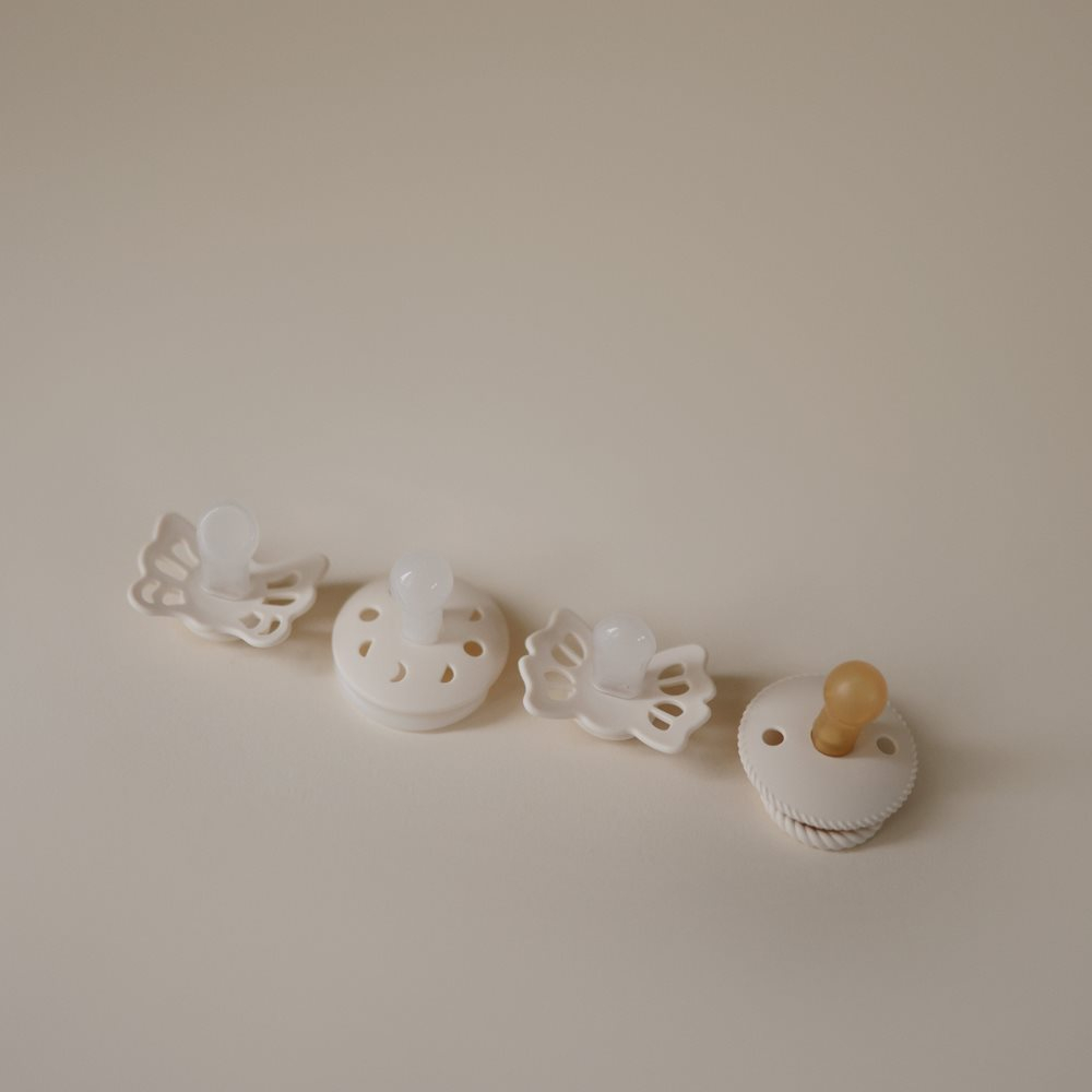 Πιπίλες σετ από την εταιρεία Frigg σε εκρού χρώμα. Το σετ αποτελείται από 4 διαφορά είδη πιπίλας. Διαθέτει 1 ανατομική κατασκευασμένη η θηλή από σιλικόνη ιατρικής ποιότητας, 2 φυσιολογικές επίσης κατασκευασμένες από σιλικόνη ιατρικής ποιότητας. Η μία από αυτές έχει φωσφοριζέ χερούλι και είναι ιδανική για την διάρκεια της νύχτας καθώς φωσφορίζει στο σκοτάδι το χερούλι. Επίσης, έχει και 1 πιπίλα φυσιολογική κατασκευασμένη η θηλή της από 100% φυσικό καουτσούκ. Είναι κατασκευασμένες οι ασπίδες τους από 100% πολυπροπυλένιο. Είναι απαλλαγμένες από BPA, BPS, PVC και φθαλικές ενώσεις. Ο σχεδιασμός τους βασίζεται στην ανατομία του στήθους μιας μητέρας, τόσο σε σχήμα όσο και σε υλικό. Όταν το παιδί πιπιλάει μια στρογγυλή πιπίλα, κυλάει τη γλώσσα του γύρω της με τον ίδιο τρόπο με τον οποίο θηλάζει. Η εταιρεία Frigg έχει ένα πατενταρισμένο σύστημα Click-lock® για τη συναρμολόγηση των πιπιλών, που εξασφαλίζει ότι τα κομμάτια είναι απόλυτα σταθερά και δεν αποσπώνται. Έτσι ελαχιστοποιεί τον κίνδυνο πνιγμού από μικρά κομμάτια, καθώς η πιπίλα είναι εξαιρετικά ανθεκτική. Πριν χρησιμοποιηθεί η πιπίλα για πρώτη φορά θα πρέπει να αποστειρωθεί. Καθαρίζεται εύκολα και αποστειρώνεται σε βραστό νερό. Δοκιμασμένο και εγκεκριμένο προϊόν σύμφωνα με το ευρωπαϊκό πρότυπο ασφαλείας EN1400 + A2. Μέτρο θηλής: 27mm.