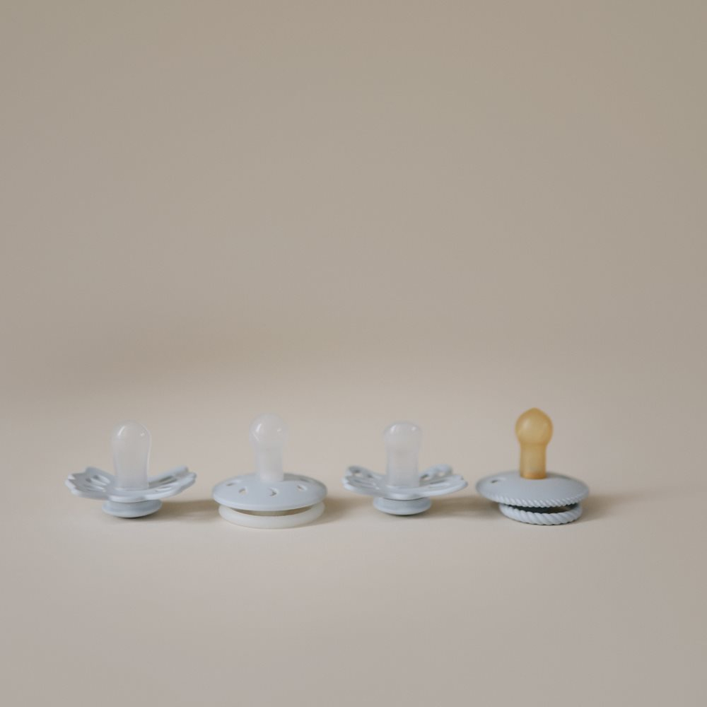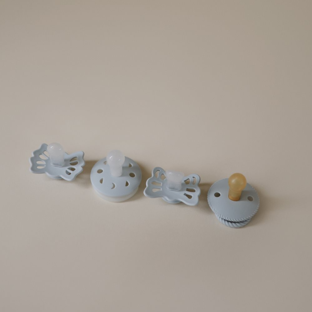 Πιπίλες σετ από την εταιρεία Frigg σε γαλάζιο χρώμα. Το σετ αποτελείται από 4 διαφορά είδη πιπίλας. Διαθέτει 1 ανατομική κατασκευασμένη η θηλή από σιλικόνη ιατρικής ποιότητας, 2 φυσιολογικές επίσης κατασκευασμένες από σιλικόνη ιατρικής ποιότητας. Η μία από αυτές έχει φωσφοριζέ χερούλι και είναι ιδανική για την διάρκεια της νύχτας καθώς φωσφορίζει στο σκοτάδι το χερούλι. Επίσης, έχει και 1 πιπίλα φυσιολογική κατασκευασμένη η θηλή της από 100% φυσικό καουτσούκ. Είναι κατασκευασμένες οι ασπίδες τους από 100% πολυπροπυλένιο. Είναι απαλλαγμένες από BPA, BPS, PVC και φθαλικές ενώσεις. Ο σχεδιασμός τους βασίζεται στην ανατομία του στήθους μιας μητέρας, τόσο σε σχήμα όσο και σε υλικό. Όταν το παιδί πιπιλάει μια στρογγυλή πιπίλα, κυλάει τη γλώσσα του γύρω της με τον ίδιο τρόπο με τον οποίο θηλάζει. Η εταιρεία Frigg έχει ένα πατενταρισμένο σύστημα Click-lock® για τη συναρμολόγηση των πιπιλών, που εξασφαλίζει ότι τα κομμάτια είναι απόλυτα σταθερά και δεν αποσπώνται. Έτσι ελαχιστοποιεί τον κίνδυνο πνιγμού από μικρά κομμάτια, καθώς η πιπίλα είναι εξαιρετικά ανθεκτική. Πριν χρησιμοποιηθεί η πιπίλα για πρώτη φορά θα πρέπει να αποστειρωθεί. Καθαρίζεται εύκολα και αποστειρώνεται σε βραστό νερό. Δοκιμασμένο και εγκεκριμένο προϊόν σύμφωνα με το ευρωπαϊκό πρότυπο ασφαλείας EN1400 + A2. Μέτρο θηλής: 27mm.