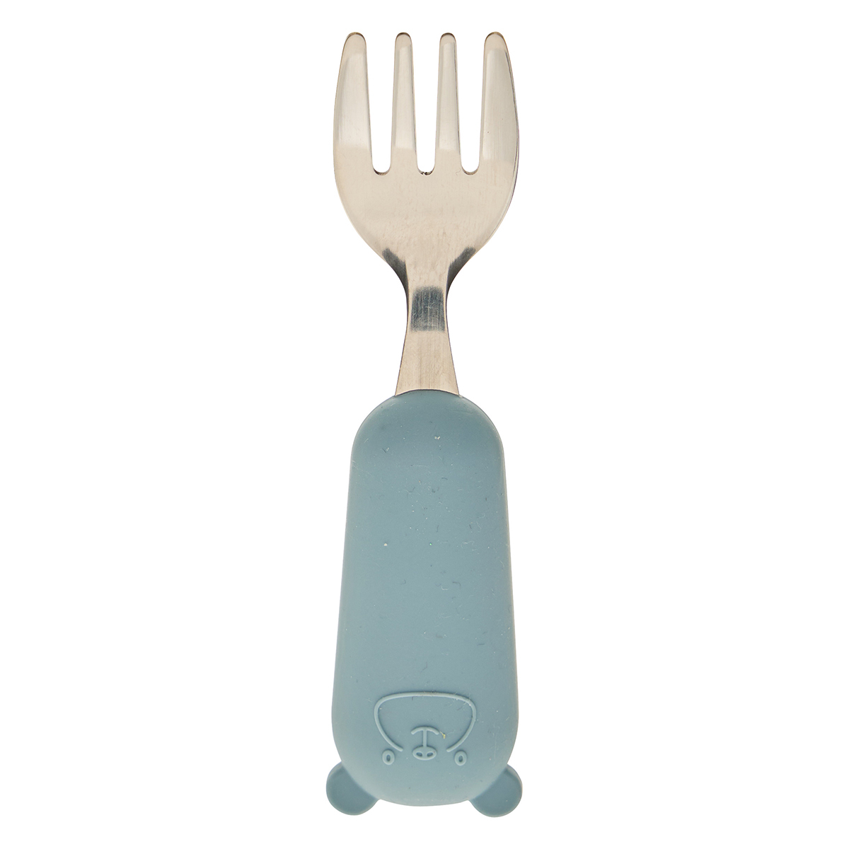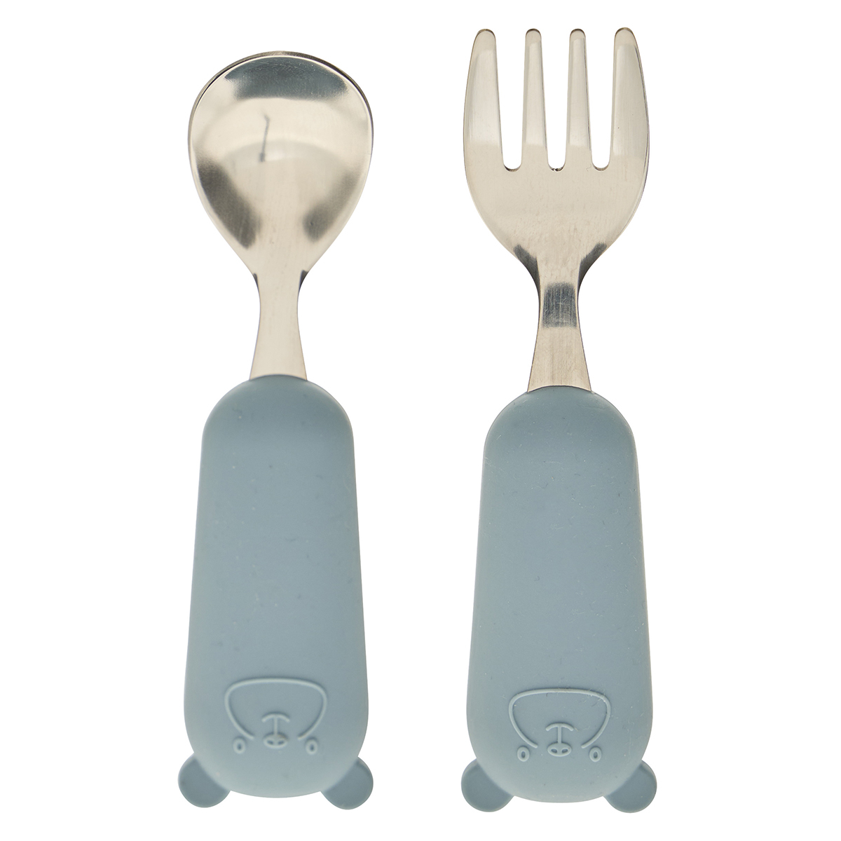 Πιρούνι και κουτάλι σε σετ με γαλάζιο χρώμα. Είναι κατασκευασμένα από ανοξείδωτο ατσάλι και είναι ειδικά σχεδιασμένα με εργονομικές λαβές σε παιδικό μέγεθος για σταθερό κράτημα από σιλικόνη. Έχουν στρογγυλεμένες άκρες για εύκολη μετάβαση των παιδιών σε κανονικά μαχαιροπίρουνα. Οι πρακτικές λαβές τους είναι ιδανικές για να μπορεί να τα κρατάει το μικρό σας με άνεση. Ιδανικό σετ για να μάθει το παιδί σας να τρώει μόνο του. Συνδυάστε το με τα υπόλοιπα είδη της ίδιας σειράς για ένα ολοκληρωμένο αποτέλεσμα.