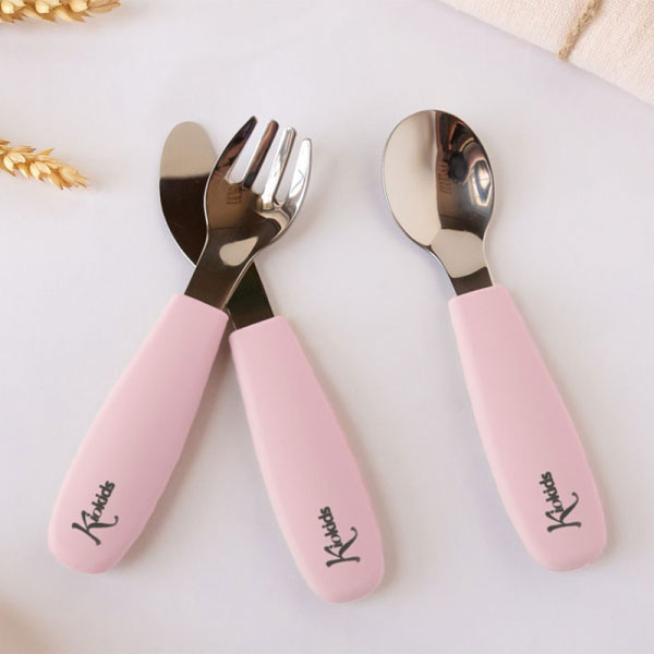 Σετ πιρούνι-μαχαίρι-κουτάλι σε ροζ χρώμα από την εταιρία Kiokids. Είναι κατασκευασμένα από ανοξείδωτο ατσάλι και ειδικά σχεδιασμένα με εργονομικές λαβές σε παιδικό μέγεθος για σταθερό κράτημα από σιλικόνη. Έχουν στρογγυλεμένες άκρες, και το μαχαίρι έχει ασφαλή λεπίδα, για εύκολη μετάβαση των παιδιών σε κανονικά μαχαιροπίρουνα.