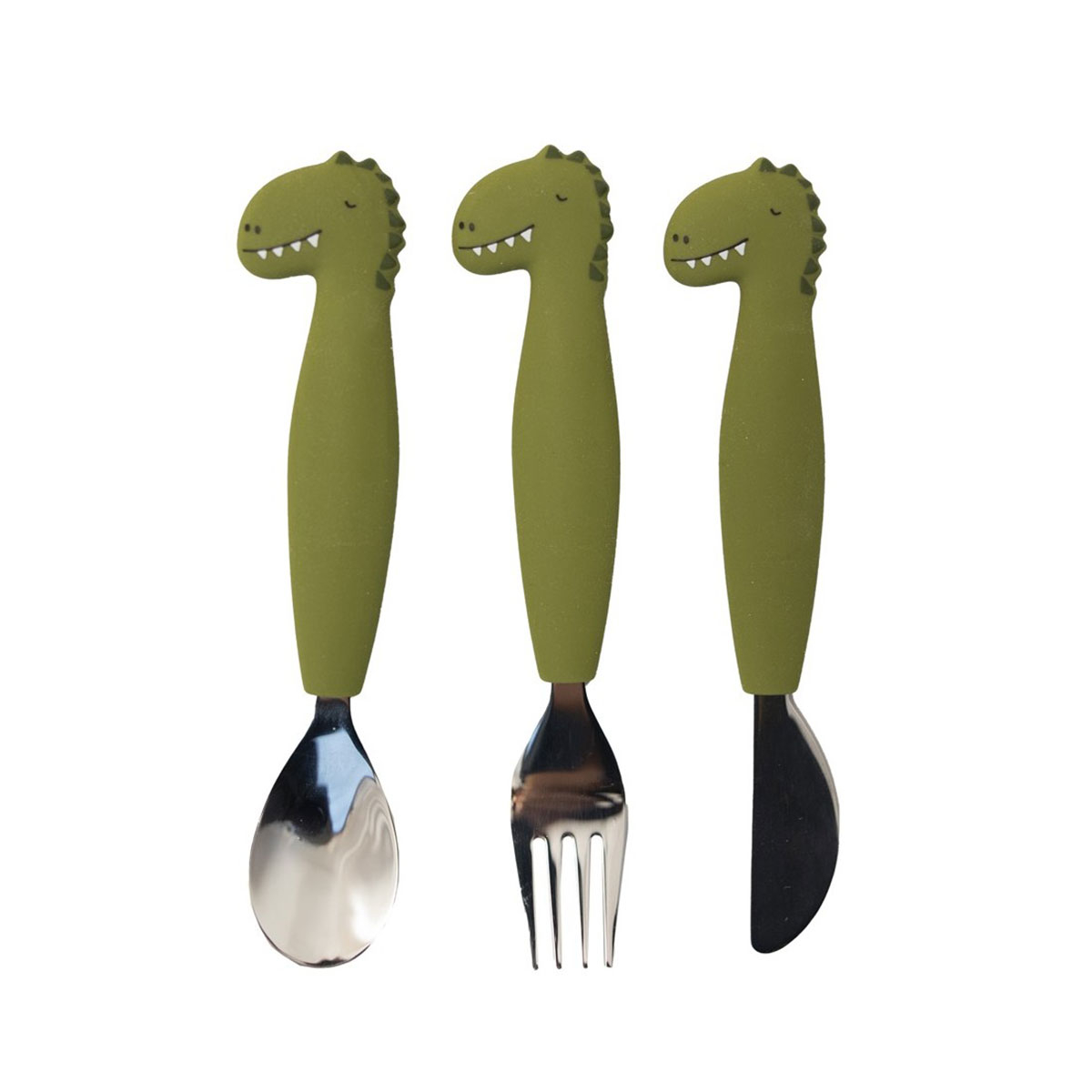 Πιρούνι-μαχαίρι-κουτάλι σετ σε πράσινο χρώμα και σχέδιο δεινόσαυρος από την εταιρία Trixie. Κατασκευασμένα από 100% ανοξείδωτο ατσάλι και λαβή από 100% σιλικόνη. Ιδανικό και ασφαλές σετ για να μάθει το παιδί σας να τρώει μόνο του.