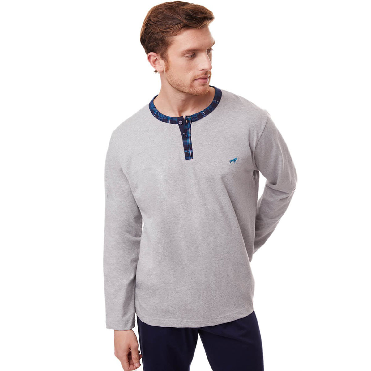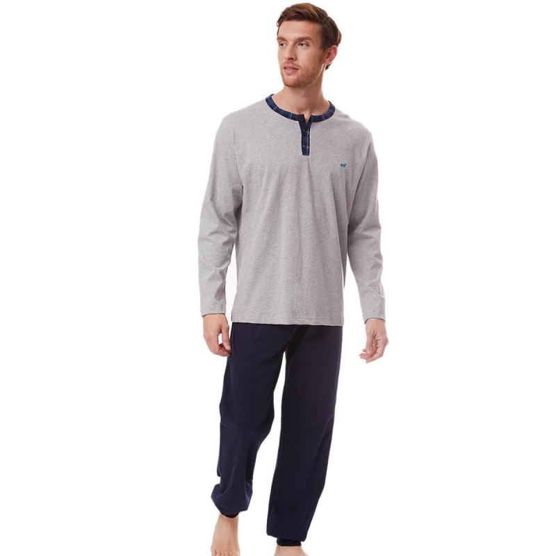 Ανδρικές πιτζάμες από την εταιρεία Minerva σε γκρι και μπλε χρώμα. Πρόκειται για μακρυμάνικη μπλούζα με στρογγυλή λαιμόκοψη και πατιλέτα με κουμπιά. Το σετ ολοκληρώνεται από παντελόνι με μανσέτες στα μπατζάκια για μεγαλύτερη άνεση και ζεστασιά. Είναι κατασκευασμένες από 100% βαμβακερό ύφασμα, που προσδίδει ιδιαίτερη απαλότητα, αντοχή και σωστή εφαρμογή. Είναι ιδιαίτερα ανθεκτικές και διατηρούν τη φόρμα τους. Τα χρώματα έχουν δημιουργηθεί με την μέθοδο της νηματοβαφής (μέσα στην ύφανση), με αποτέλεσμα να παραμένουν αναλλοίωτα στην χρήση και τις πλύσεις. Τα προϊόντα Minerva διαθέτουν τα διεθνή πιστοποιητικά ποιότητας και ασφάλειας ISO 9001:2000 , ISO 9002, Oeko-Tex Standard 100, Eco Textile Label. Σε όλα τα στάδια παραγωγής έχουν χρησιμοποιηθεί υποαλλεργικά υλικά χωρίς επιβλαβείς ουσίες προς την υγεία. Αποτελούν προϊόντα ελληνικής ραφής με την εγγύηση ποιότητας και αξιοπιστίας της εταιρείας Minerva.