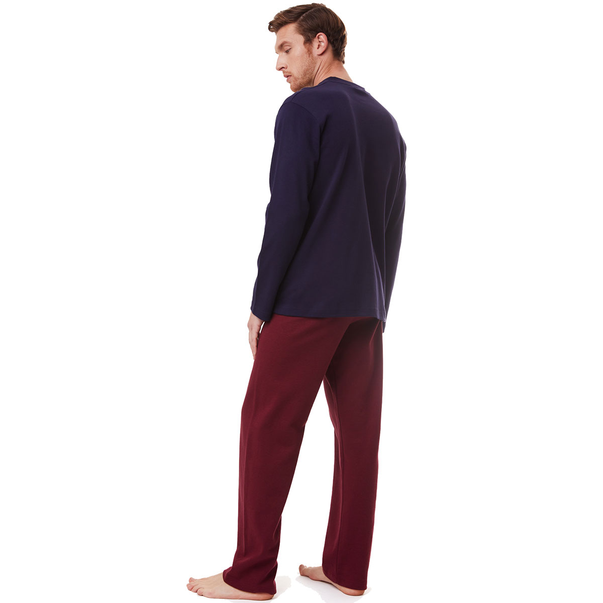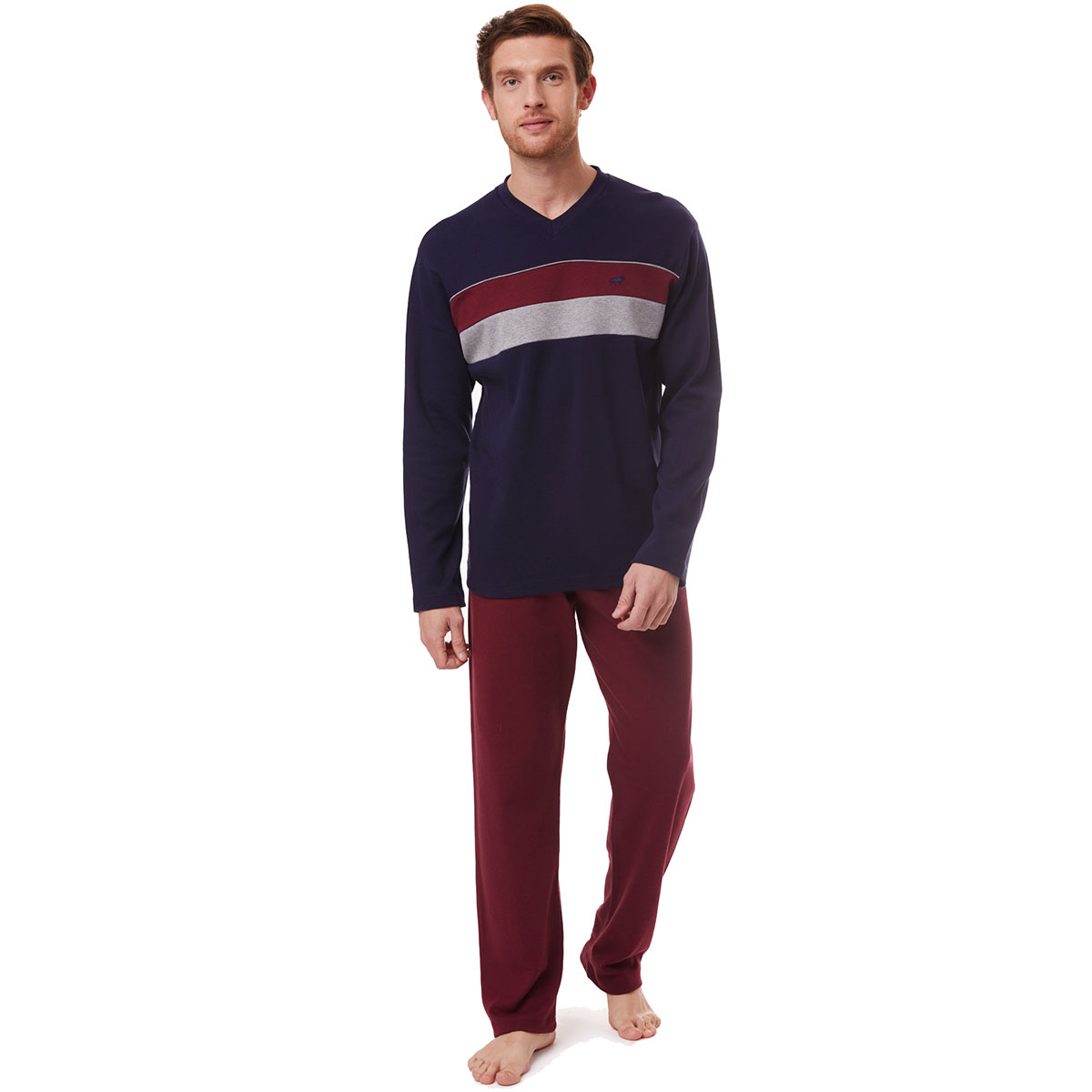 Ανδρικές πιτζάμες από την εταιρεία Minerva σε μπορντώ και μπλε χρώμα. Πρόκειται για μακρυμάνικη μπλούζα με V λαιμόκοψη. Το σετ ολοκληρώνεται από παντελόνι με μανσέτες στα μπατζάκια για μεγαλύτερη άνεση και ζεστασιά. Είναι κατασκευασμένες από εξαιρετικής ποιότητας ύφασμα σύνθεσης 90% βαμβάκι και 10% nylon, που προσδίδει ιδιαίτερη απαλότητα, αντοχή και σωστή εφαρμογή, που προσδίδει ιδιαίτερη απαλότητα, αντοχή και σωστή εφαρμογή. Είναι ιδιαίτερα ανθεκτικές και διατηρούν τη φόρμα τους. Τα χρώματα έχουν δημιουργηθεί με την μέθοδο της νηματοβαφής (μέσα στην ύφανση), με αποτέλεσμα να παραμένουν αναλλοίωτα στην χρήση και τις πλύσεις. Τα προϊόντα Minerva διαθέτουν τα διεθνή πιστοποιητικά ποιότητας και ασφάλειας ISO 9001:2000 , ISO 9002, Oeko-Tex Standard 100, Eco Textile Label. Σε όλα τα στάδια παραγωγής έχουν χρησιμοποιηθεί υποαλλεργικά υλικά χωρίς επιβλαβείς ουσίες προς την υγεία. Αποτελούν προϊόντα ελληνικής ραφής με την εγγύηση ποιότητας και αξιοπιστίας της εταιρείας Minerva.