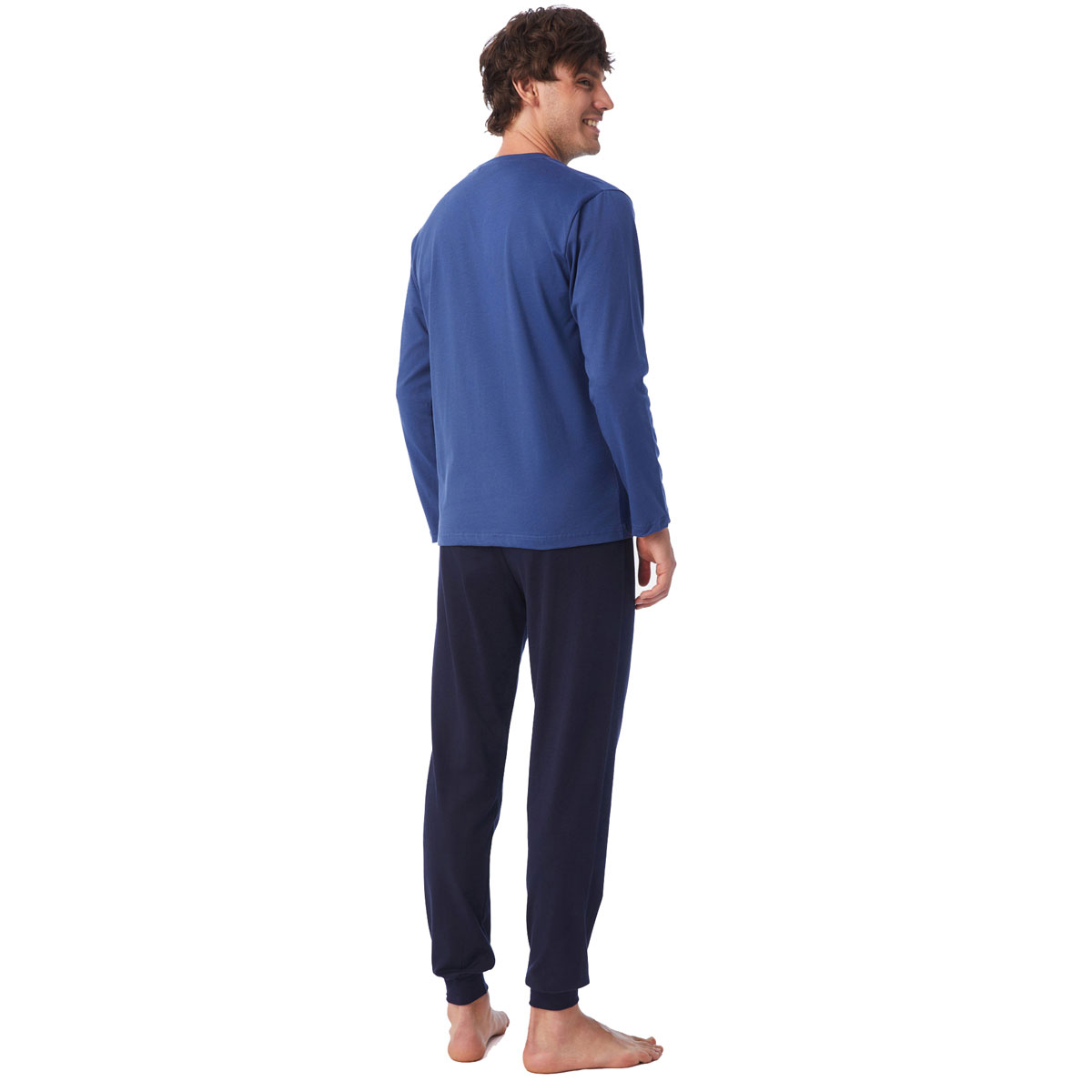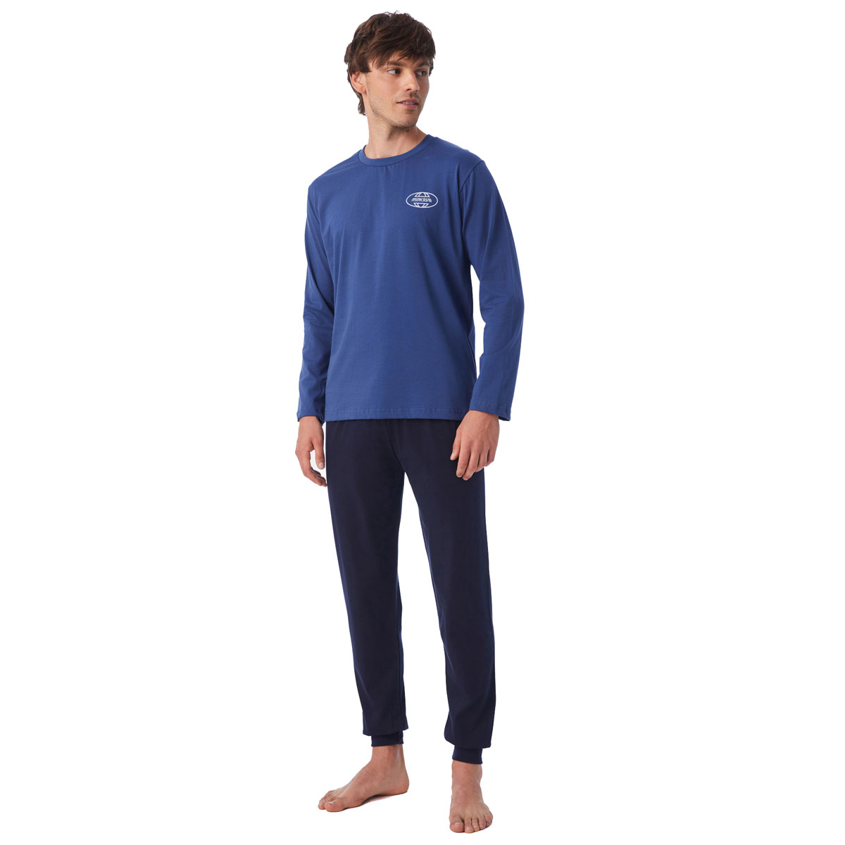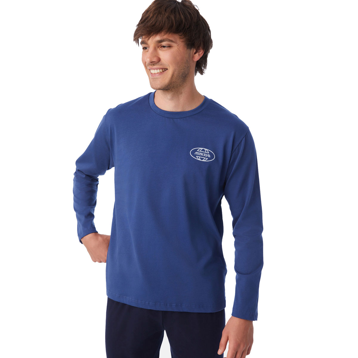Ανδρικές πιτζάμες από την εταιρεία Minerva σε μπλε και μαύρο χρώμα. Πρόκειται για μακρυμάνικη μπλούζα με στρογγυλή λαιμόκοψη. Το σετ ολοκληρώνεται από κομψό παντελόνι με μανσέτες στα μπατζάκια. Είναι κατασκευασμένες από 100% βαμβακερό ύφασμα, που προσδίδει ιδιαίτερη απαλότητα, αντοχή και σωστή εφαρμογή. Είναι ιδιαίτερα ανθεκτικές και διατηρούν τη φόρμα τους. Τα χρώματα έχουν δημιουργηθεί με την μέθοδο της νηματοβαφής (μέσα στην ύφανση), με αποτέλεσμα να παραμένουν αναλλοίωτα στην χρήση και τις πλύσεις. Τα προϊόντα Minerva διαθέτουν τα διεθνή πιστοποιητικά ποιότητας και ασφάλειας ISO 9001:2000 , ISO 9002, Oeko-Tex Standard 100, Eco Textile Label. Σε όλα τα στάδια παραγωγής έχουν χρησιμοποιηθεί υποαλλεργικά υλικά χωρίς επιβλαβείς ουσίες προς την υγεία. Αποτελούν προϊόντα ελληνικής ραφής με την εγγύηση ποιότητας και αξιοπιστίας της εταιρείας Minerva.