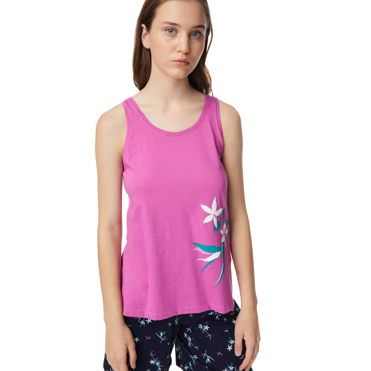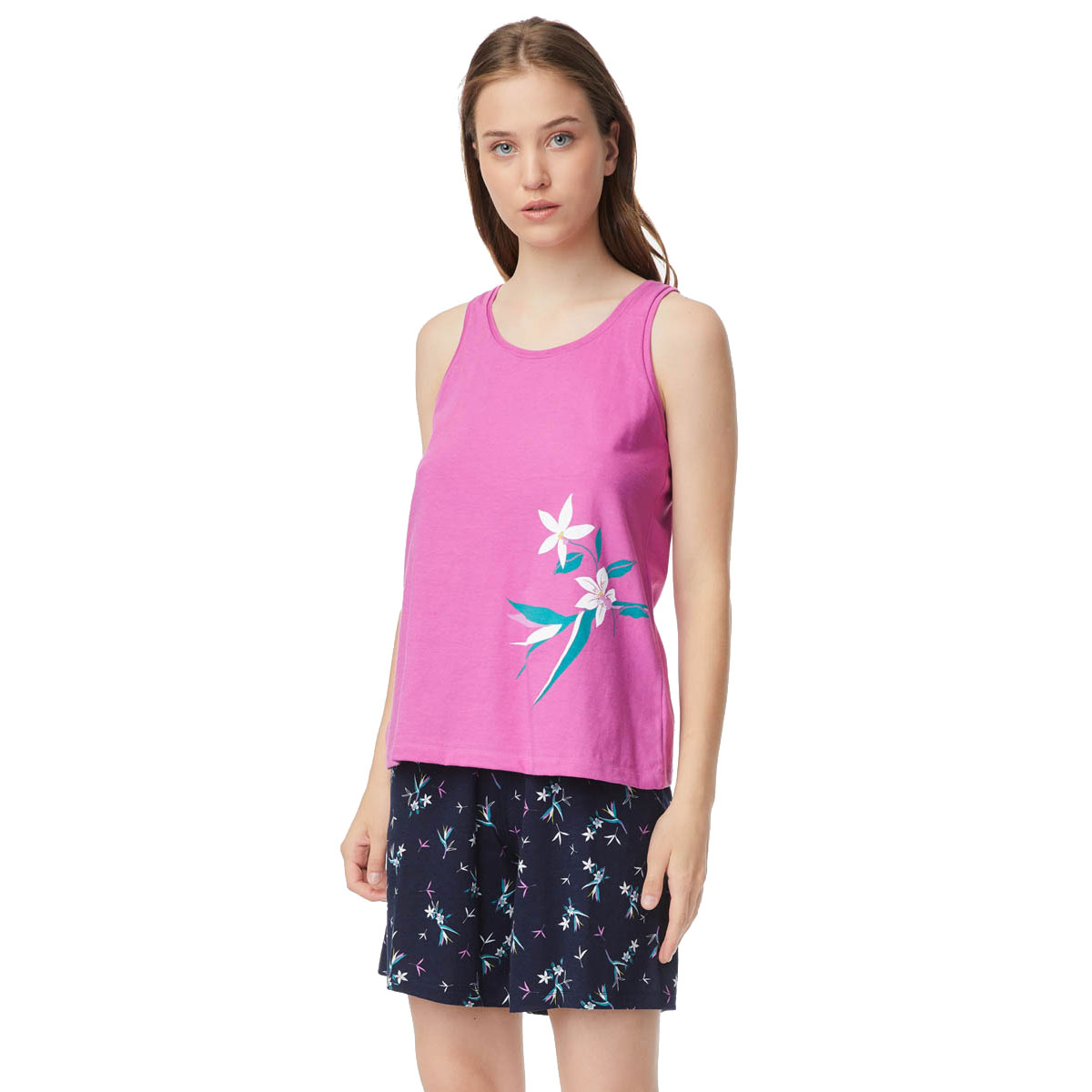 Σετ γυναικείες πιτζάμες από την εταιρεία Minerva σε μπλε απόχρωση με φλοράλ σχέδιο. Η μπλούζα είναι φούξια, αμάνικη με τυπωτό λουλούδι στο πλάι. Το σετ ολοκληρώνεται από μπλε σορτσάκι με φλοράλ μοτίβο. Είναι κατασκευασμένες από 100% βαμβακερό ύφασμα, που προσδίδει ιδιαίτερη απαλότητα, αντοχή και σωστή εφαρμογή. Είναι ιδιαίτερα ανθεκτικές και διατηρούν τη φόρμα τους. Τα χρώματα έχουν δημιουργηθεί με την μέθοδο της νηματοβαφής (μέσα στην ύφανση), με αποτέλεσμα να παραμένουν αναλλοίωτα στην χρήση και τις πλύσεις. Τα προϊόντα Minerva διαθέτουν τα διεθνή πιστοποιητικά ποιότητας και ασφάλειας ISO 9001:2000 , ISO 9002, Oeko-Tex Standard 100, Eco Textile Label. Σε όλα τα στάδια παραγωγής έχουν χρησιμοποιηθεί υποαλλεργικά υλικά χωρίς επιβλαβείς ουσίες προς την υγεία. Αποτελούν προϊόντα ελληνικής ραφής με την εγγύηση ποιότητας και αξιοπιστίας της εταιρείας Minerva.