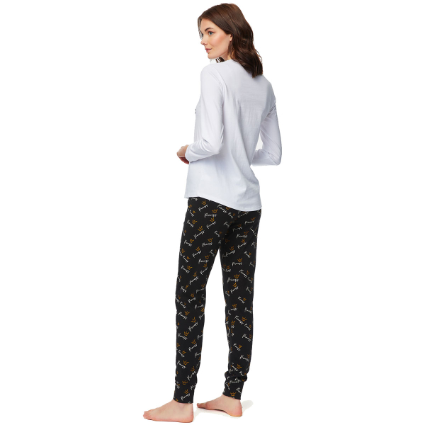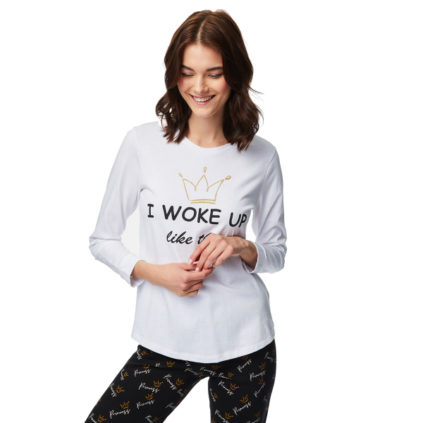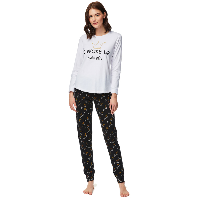 Γυναικείες πιτζάμες από την εταιρεία Minerva σε λευκό και μαύρο χρώμα. Πρόκειται για μακρυμάνικη μπλούζα με στρογγυλή λαιμόκοψη και μοντέρνο σχέδιο. Το σετ ολοκληρώνεται από μαύρο παντελόνι με μανσέτες στα μπατζάκια για μεγαλύτερη άνεση και ζεστασιά. Είναι κατασκευασμένες από 100% βαμβακερό ύφασμα, που προσδίδει ιδιαίτερη απαλότητα, αντοχή και σωστή εφαρμογή. Είναι ιδιαίτερα ανθεκτικές και διατηρούν τη φόρμα τους. Τα χρώματα έχουν δημιουργηθεί με την μέθοδο της νηματοβαφής (μέσα στην ύφανση), με αποτέλεσμα να παραμένουν αναλλοίωτα στην χρήση και τις πλύσεις. Τα προϊόντα Minerva διαθέτουν τα διεθνή πιστοποιητικά ποιότητας και ασφάλειας ISO 9001:2000 , ISO 9002, Oeko-Tex Standard 100, Eco Textile Label. Σε όλα τα στάδια παραγωγής έχουν χρησιμοποιηθεί υποαλλεργικά υλικά χωρίς επιβλαβείς ουσίες προς την υγεία. Αποτελούν προϊόντα ελληνικής ραφής με την εγγύηση ποιότητας και αξιοπιστίας της εταιρείας Minerva.