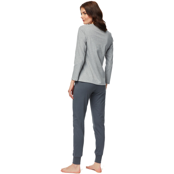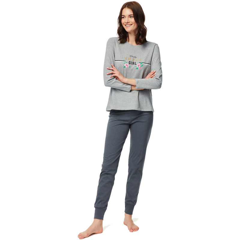 Γυναικείες πιτζάμες από την εταιρεία Minerva σε γκρι αποχρώσεις. Πρόκειται για μακρυμάνικη μπλούζα με στρογγυλή λαιμόκοψη και μοντέρνο σχέδιο. Το σετ ολοκληρώνεται από μονόχρωμο παντελόνι με μανσέτες στα μπατζάκια για μεγαλύτερη άνεση και ζεστασιά. Είναι κατασκευασμένες από 100% βαμβακερό ύφασμα, που προσδίδει ιδιαίτερη απαλότητα, αντοχή και σωστή εφαρμογή. Είναι ιδιαίτερα ανθεκτικές και διατηρούν τη φόρμα τους. Τα χρώματα έχουν δημιουργηθεί με την μέθοδο της νηματοβαφής (μέσα στην ύφανση), με αποτέλεσμα να παραμένουν αναλλοίωτα στην χρήση και τις πλύσεις. Τα προϊόντα Minerva διαθέτουν τα διεθνή πιστοποιητικά ποιότητας και ασφάλειας ISO 9001:2000 , ISO 9002, Oeko-Tex Standard 100, Eco Textile Label. Σε όλα τα στάδια παραγωγής έχουν χρησιμοποιηθεί υποαλλεργικά υλικά χωρίς επιβλαβείς ουσίες προς την υγεία. Αποτελούν προϊόντα ελληνικής ραφής με την εγγύηση ποιότητας και αξιοπιστίας της εταιρείας Minerva.