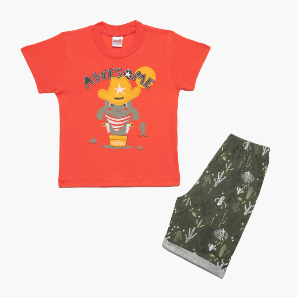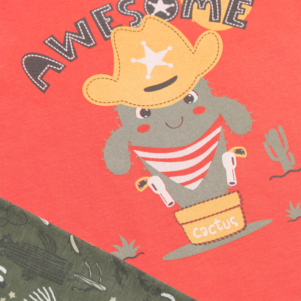 Παιδικές πιτζάμες (κωδ.: 61943-471) από τη συλλογή Minervakia της εταιρείας Minerva. Πρόκειται για σετ από κοντομάνικη μπλούζα με σορτσάκι. Έχουν χακί και κοραλί αποχρώσεις και φέρουν μοντέρνα παιδική παράσταση. Είναι κατασκευασμένες από 100% βαμβακερό ύφασμα, που προσδίδει ιδιαίτερη απαλότητα, αντοχή και σωστή εφαρμογή. Είναι ιδιαίτερα ανθεκτικές και διατηρούν τη φόρμα τους. Τα χρώματα έχουν δημιουργηθεί με την μέθοδο της νηματοβαφής (μέσα στην ύφανση), με αποτέλεσμα να παραμένουν αναλλοίωτα στην χρήση και τις πλύσεις. Σε όλα τα στάδια παραγωγής έχουν χρησιμοποιηθεί υποαλλεργικά υλικά χωρίς επιβλαβείς ουσίες προς την υγεία. Διαθέτουν τα διεθνή πιστοποιητικά ποιότητας και ασφάλειας ISO 9001:2000 , ISO 9002, Oeko-Tex Standard 100, Eco Textile Label. Αποτελούν προϊόντα ελληνικής ραφής με την εγγύηση ποιότητας και αξιοπιστίας της εταιρείας Minerva. Μεγεθολόγιο ανάλογα με ηλικία και ύψος παιδιού: Νο1 (1-2 ετών, 78-90cm), Νο2 (2-3 ετών, 90-98cm), No3 (3-4 ετών, 98-104cm), No4 (4-6 ετών, 104-116cm), No6 (6-8 ετών, 116-128cm), No8 (8-10 ετών, 128-140cm), No10 (10-12 ετών, 140-152cm), No12 (12-14 ετών, 152-164cm για αγόρι, 152-158cm για κορίτσι), No14 (14-16 ετών, 164-172cm για αγόρι, 158-164cm για κορίτσι), No16 (16-18 ετών, 172-180cm για αγόρι, 164-170cm για κορίτσι)