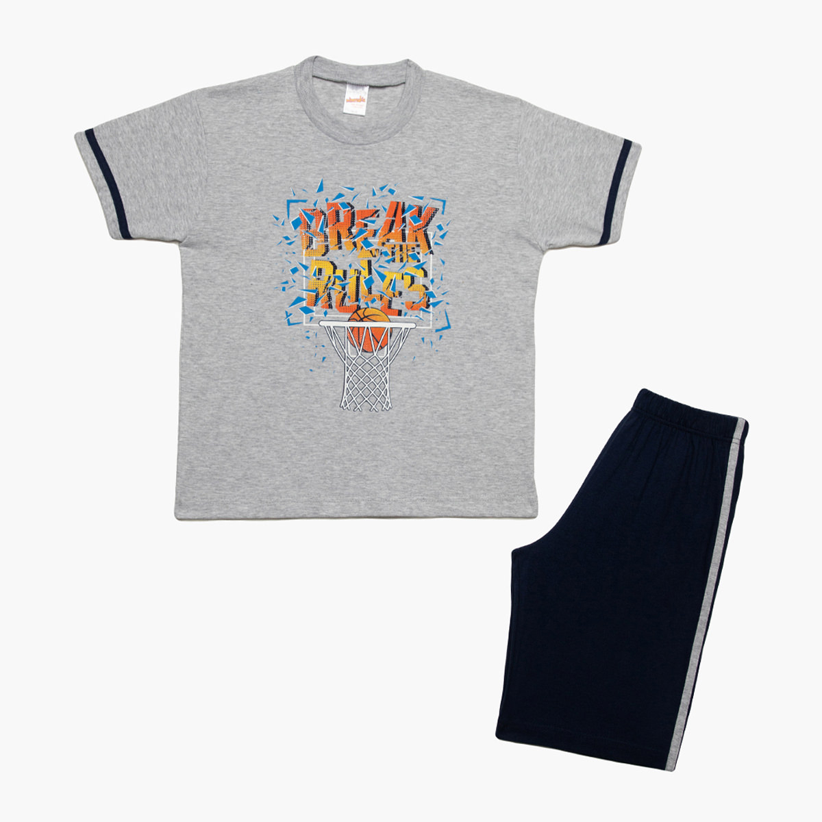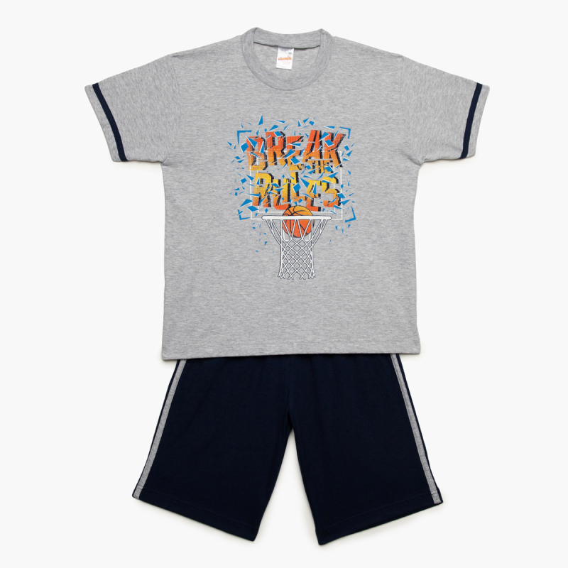 Παιδικές πιτζάμες (κωδ.: 61956-133) από τη συλλογή Minervakia της εταιρείας Minerva. Πρόκειται για σετ από κοντομάνικη μπλούζα με σορτσάκι. Έχουν γκρι μελανζέ και μπλε χρώμα και φέρουν μοντέρνο σχέδιο. Είναι κατασκευασμένες από 100% βαμβακερό ύφασμα, που προσδίδει ιδιαίτερη απαλότητα, αντοχή και σωστή εφαρμογή. Είναι ιδιαίτερα ανθεκτικές και διατηρούν τη φόρμα τους. Τα χρώματα έχουν δημιουργηθεί με την μέθοδο της νηματοβαφής (μέσα στην ύφανση), με αποτέλεσμα να παραμένουν αναλλοίωτα στην χρήση και τις πλύσεις. Σε όλα τα στάδια παραγωγής έχουν χρησιμοποιηθεί υποαλλεργικά υλικά χωρίς επιβλαβείς ουσίες προς την υγεία. Διαθέτουν τα διεθνή πιστοποιητικά ποιότητας και ασφάλειας ISO 9001:2000 , ISO 9002, Oeko-Tex Standard 100, Eco Textile Label. Αποτελούν προϊόντα ελληνικής ραφής με την εγγύηση ποιότητας και αξιοπιστίας της εταιρείας Minerva. Μεγεθολόγιο ανάλογα με ηλικία και ύψος παιδιού: Νο1 (1-2 ετών, 78-90cm), Νο2 (2-3 ετών, 90-98cm), No3 (3-4 ετών, 98-104cm), No4 (4-6 ετών, 104-116cm), No6 (6-8 ετών, 116-128cm), No8 (8-10 ετών, 128-140cm), No10 (10-12 ετών, 140-152cm), No12 (12-14 ετών, 152-164cm για αγόρι, 152-158cm για κορίτσι), No14 (14-16 ετών, 164-172cm για αγόρι, 158-164cm για κορίτσι), No16 (16-18 ετών, 172-180cm για αγόρι, 164-170cm για κορίτσι)