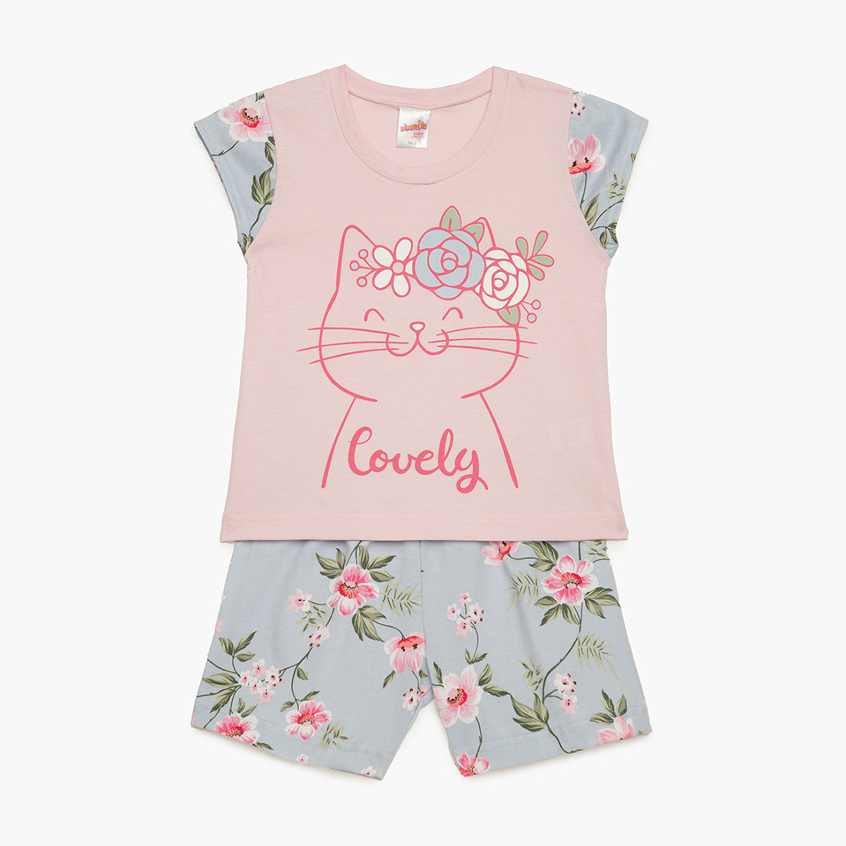 Παιδικές πιτζάμες από τη συλλογή Minervakia της εταιρείας Minerva. Πρόκειται για σετ από κοντομάνικη μπλούζα με σορτσάκι. Έχουν ροζ και γαλάζιο χρώμα και γάτα στο σχέδιο. Το σορτσάκι έχει φλοράλ σχέδιο. Είναι κατασκευασμένες από 100% βαμβακερό ύφασμα, που προσδίδει ιδιαίτερη απαλότητα, αντοχή και σωστή εφαρμογή. Είναι ιδιαίτερα ανθεκτικές και διατηρούν τη φόρμα τους. Τα χρώματα έχουν δημιουργηθεί με την μέθοδο της νηματοβαφής (μέσα στην ύφανση), με αποτέλεσμα να παραμένουν αναλλοίωτα στην χρήση και τις πλύσεις. Σε όλα τα στάδια παραγωγής έχουν χρησιμοποιηθεί υποαλλεργικά υλικά χωρίς επιβλαβείς ουσίες προς την υγεία. Διαθέτουν τα διεθνή πιστοποιητικά ποιότητας και ασφάλειας ISO 9001:2000 , ISO 9002, Oeko-Tex Standard 100, Eco Textile Label. Αποτελούν προϊόντα ελληνικής ραφής με την εγγύηση ποιότητας και αξιοπιστίας της εταιρείας Minerva. Μεγεθολόγιο ανάλογα με ηλικία και ύψος παιδιού: Νο1 (1-2 ετών, 78-90cm), Νο2 (2-3 ετών, 90-98cm), No3 (3-4 ετών, 98-104cm), No4 (4-6 ετών, 104-116cm), No6 (6-8 ετών, 116-128cm), No8 (8-10 ετών, 128-140cm), No10 (10-12 ετών, 140-152cm), No12 (12-14 ετών, 152-164cm για αγόρι, 152-158cm για κορίτσι), No14 (14-16 ετών, 164-172cm για αγόρι, 158-164cm για κορίτσι), No16 (16-18 ετών, 172-180cm για αγόρι, 164-170cm για κορίτσι)