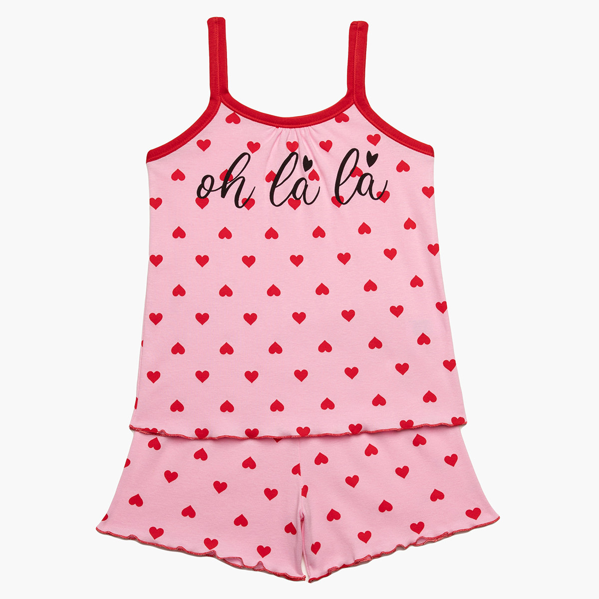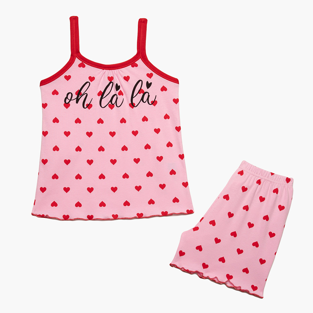 Παιδικές πιτζάμες (κωδ.: 61965-128) από τη συλλογή Minervakia της εταιρείας Minerva. Πρόκειται για σετ από αμάνικη μπλούζα με σορτσάκι. Έχουν ροζ απόχρωση και φέρουν χαριτωμένο σχέδιο με κόκκινες καρδούλες. Είναι κατασκευασμένες από 100% βαμβακερό ύφασμα, που προσδίδει ιδιαίτερη απαλότητα, αντοχή και σωστή εφαρμογή. Είναι ιδιαίτερα ανθεκτικές και διατηρούν τη φόρμα τους. Τα χρώματα έχουν δημιουργηθεί με την μέθοδο της νηματοβαφής (μέσα στην ύφανση), με αποτέλεσμα να παραμένουν αναλλοίωτα στην χρήση και τις πλύσεις. Σε όλα τα στάδια παραγωγής έχουν χρησιμοποιηθεί υποαλλεργικά υλικά χωρίς επιβλαβείς ουσίες προς την υγεία. Διαθέτουν τα διεθνή πιστοποιητικά ποιότητας και ασφάλειας ISO 9001:2000 , ISO 9002, Oeko-Tex Standard 100, Eco Textile Label. Αποτελούν προϊόντα ελληνικής ραφής με την εγγύηση ποιότητας και αξιοπιστίας της εταιρείας Minerva. Μεγεθολόγιο ανάλογα με ηλικία και ύψος παιδιού: Νο1 (1-2 ετών, 78-90cm), Νο2 (2-3 ετών, 90-98cm), No3 (3-4 ετών, 98-104cm), No4 (4-6 ετών, 104-116cm), No6 (6-8 ετών, 116-128cm), No8 (8-10 ετών, 128-140cm), No10 (10-12 ετών, 140-152cm), No12 (12-14 ετών, 152-164cm για αγόρι, 152-158cm για κορίτσι), No14 (14-16 ετών, 164-172cm για αγόρι, 158-164cm για κορίτσι), No16 (16-18 ετών, 172-180cm για αγόρι, 164-170cm για κορίτσι)