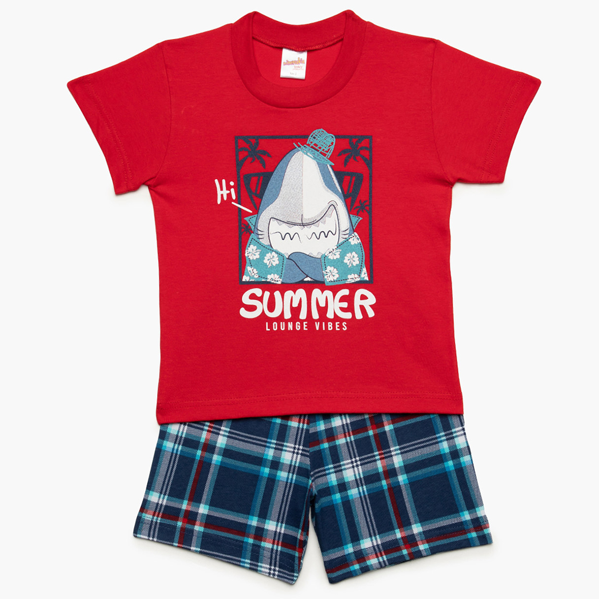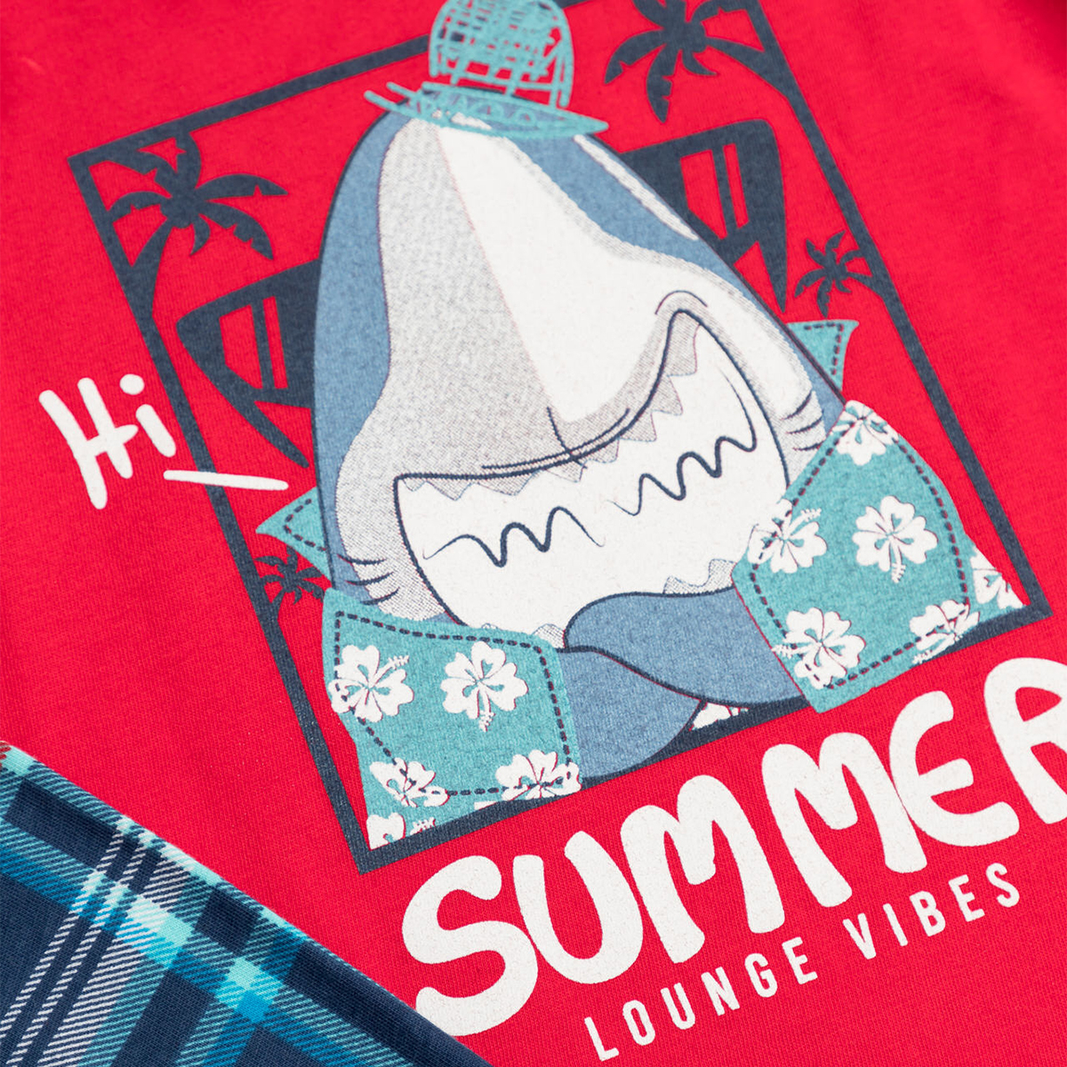 Παιδικές πιτζάμες (κωδ.: 61941-118) από τη συλλογή Minervakia της εταιρείας Minerva. Πρόκειται για σετ από κοντομάνικη μπλούζα με σορτσάκι. Έχουν κόκκινη και μπλε απόχρωση και φέρουν μοντέρνα παιδική παράσταση με καρχαρία και καρό μοτίβο. Είναι κατασκευασμένες από 100% βαμβακερό ύφασμα, που προσδίδει ιδιαίτερη απαλότητα, αντοχή και σωστή εφαρμογή. Είναι ιδιαίτερα ανθεκτικές και διατηρούν τη φόρμα τους. Τα χρώματα έχουν δημιουργηθεί με την μέθοδο της νηματοβαφής (μέσα στην ύφανση), με αποτέλεσμα να παραμένουν αναλλοίωτα στην χρήση και τις πλύσεις. Σε όλα τα στάδια παραγωγής έχουν χρησιμοποιηθεί υποαλλεργικά υλικά χωρίς επιβλαβείς ουσίες προς την υγεία. Διαθέτουν τα διεθνή πιστοποιητικά ποιότητας και ασφάλειας ISO 9001:2000 , ISO 9002, Oeko-Tex Standard 100, Eco Textile Label. Αποτελούν προϊόντα ελληνικής ραφής με την εγγύηση ποιότητας και αξιοπιστίας της εταιρείας Minerva. Μεγεθολόγιο ανάλογα με ηλικία και ύψος παιδιού: Νο1 (1-2 ετών, 78-90cm), Νο2 (2-3 ετών, 90-98cm), No3 (3-4 ετών, 98-104cm), No4 (4-6 ετών, 104-116cm), No6 (6-8 ετών, 116-128cm), No8 (8-10 ετών, 128-140cm), No10 (10-12 ετών, 140-152cm), No12 (12-14 ετών, 152-164cm για αγόρι, 152-158cm για κορίτσι), No14 (14-16 ετών, 164-172cm για αγόρι, 158-164cm για κορίτσι), No16 (16-18 ετών, 172-180cm για αγόρι, 164-170cm για κορίτσι)