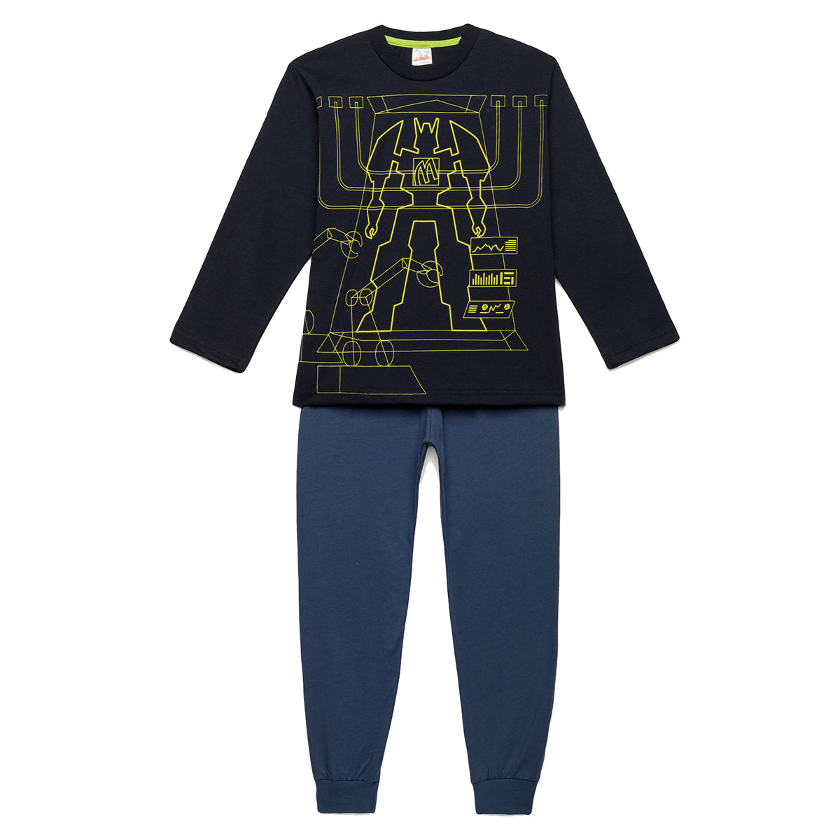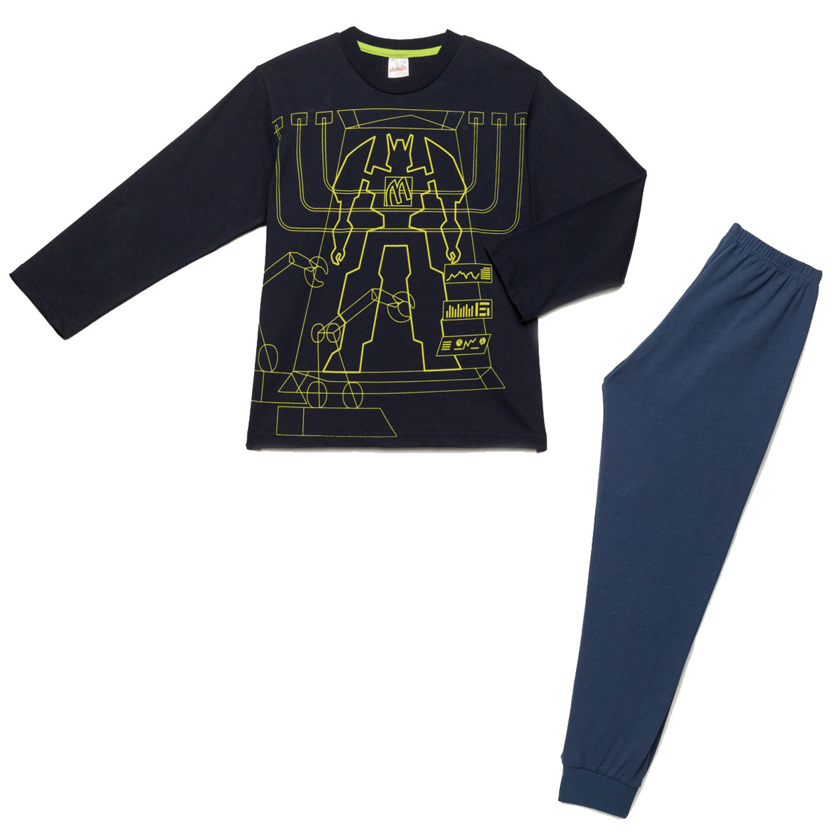 Παιδικές πιτζάμες από τη συλλογή Minervakia της εταιρείας Minerva. Πρόκειται για σετ από μακρυμάνικη μπλούζα με παντελόνι. Έχουν μαύρο και μπλε χρώμα με κίτρινες λεπτομέρειες και μοντέρνο σχέδιο. Είναι κατασκευασμένες από 100% βαμβακερό ύφασμα, που προσδίδει ιδιαίτερη απαλότητα, αντοχή και σωστή εφαρμογή. Είναι ιδιαίτερα ανθεκτικές και διατηρούν τη φόρμα τους. Τα χρώματα έχουν δημιουργηθεί με την μέθοδο της νηματοβαφής (μέσα στην ύφανση), με αποτέλεσμα να παραμένουν αναλλοίωτα στην χρήση και τις πλύσεις. Σε όλα τα στάδια παραγωγής έχουν χρησιμοποιηθεί υποαλλεργικά υλικά χωρίς επιβλαβείς ουσίες προς την υγεία. Διαθέτουν τα διεθνή πιστοποιητικά ποιότητας και ασφάλειας ISO 9001:2000 , ISO 9002, Oeko-Tex Standard 100, Eco Textile Label. Αποτελούν προϊόντα ελληνικής ραφής με την εγγύηση ποιότητας και αξιοπιστίας της εταιρείας Minerva. Μεγεθολόγιο ανάλογα με ηλικία και ύψος παιδιού: Νο1 (1-2 ετών, 78-90cm), Νο2 (2-3 ετών, 90-98cm), No3 (3-4 ετών, 98-104cm), No4 (4-6 ετών, 104-116cm), No6 (6-8 ετών, 116-128cm), No8 (8-10 ετών, 128-140cm), No10 (10-12 ετών, 140-152cm), No12 (12-14 ετών, 152-164cm για αγόρι, 152-158cm για κορίτσι), No14 (14-16 ετών, 164-172cm για αγόρι, 158-164cm για κορίτσι), No16 (16-18 ετών, 172-180cm για αγόρι, 164-170cm για κορίτσι)